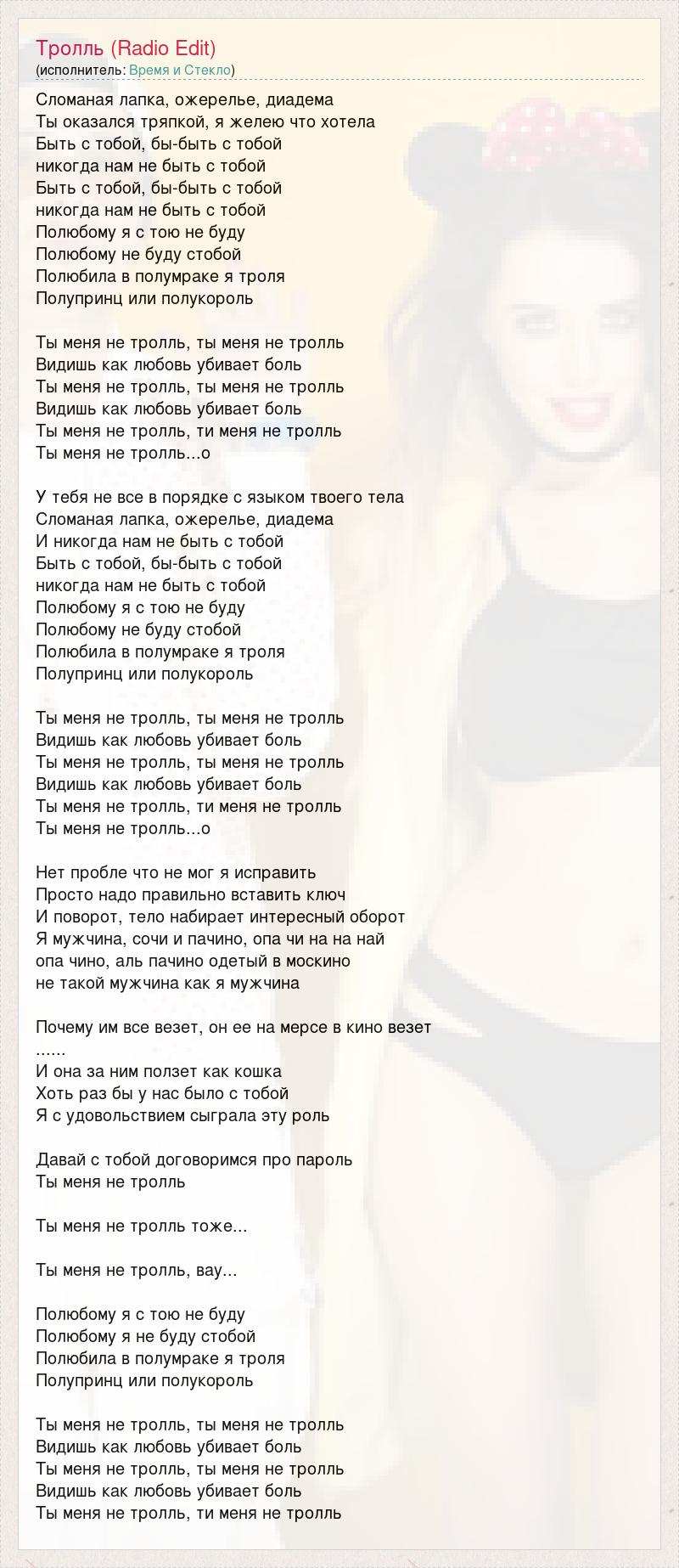 Сломаная лапка, ожерелье, диадема Ты оказался тряпкой, я желею что хотела Быть с тобой, бы-быть с тобой никогда нам не быть с тобой Быть с тобой, бы-быть с тобой никогда нам не быть с тобой Полюбому я с тою не буду Полюбому не буду стобой Полюбила в полумраке я троля Полупринц или полукороль Ты меня не тролль, ты меня не тролль Видишь как любовь убивает боль Ты меня не тролль, ты меня не тролль Видишь как любовь убивает боль Ты меня не тролль, ти меня не тролль Ты меня не тролль...о У тебя не все в порядке с языком твоего тела Сломаная лапка, ожерелье, диадема И никогда нам не быть с тобой Быть с тобой, бы-быть с тобой никогда нам не быть с тобой Полюбому я с тою не буду Полюбому не буду стобой Полюбила в полумраке я троля Полупринц или полукороль Ты меня не тролль, ты меня не тролль Видишь как любовь убивает боль Ты меня не тролль, ты меня не тролль Видишь как любовь убивает боль Ты меня не тролль, ти меня не тролль Ты меня не тролль...о Нет пробле что не мог я исправить Просто надо правильно вставить ключ И поворот, тело набирает интересный оборот Я мужчина, сочи и пачино, опа чи на на най опа чино, аль пачино одетый в москино не такой мужчина как я мужчина Почему им все везет, он ее на мерсе в кино везет ...... И она за ним ползет как кошка Хоть раз бы у нас было с тобой Я с удовольствием сыграла эту роль Давай с тобой договоримся про пароль Ты меня не тролль Ты меня не тролль тоже... Ты меня не тролль, вау... Полюбому я с тою не буду Полюбому я не буду стобой Полюбила в полумраке я троля Полупринц или полукороль Ты меня не тролль, ты меня не тролль Видишь как любовь убивает боль Ты меня не тролль, ты меня не тролль Видишь как любовь убивает боль Ты меня не тролль, ти меня не тролль