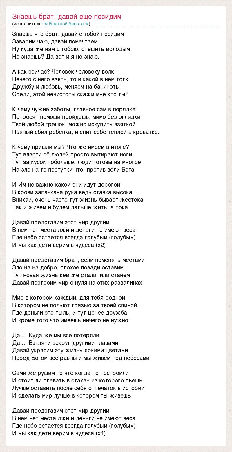 А как ты думаешь, о чем песня "Знаешь что брат, давай с тобой посидим" ?