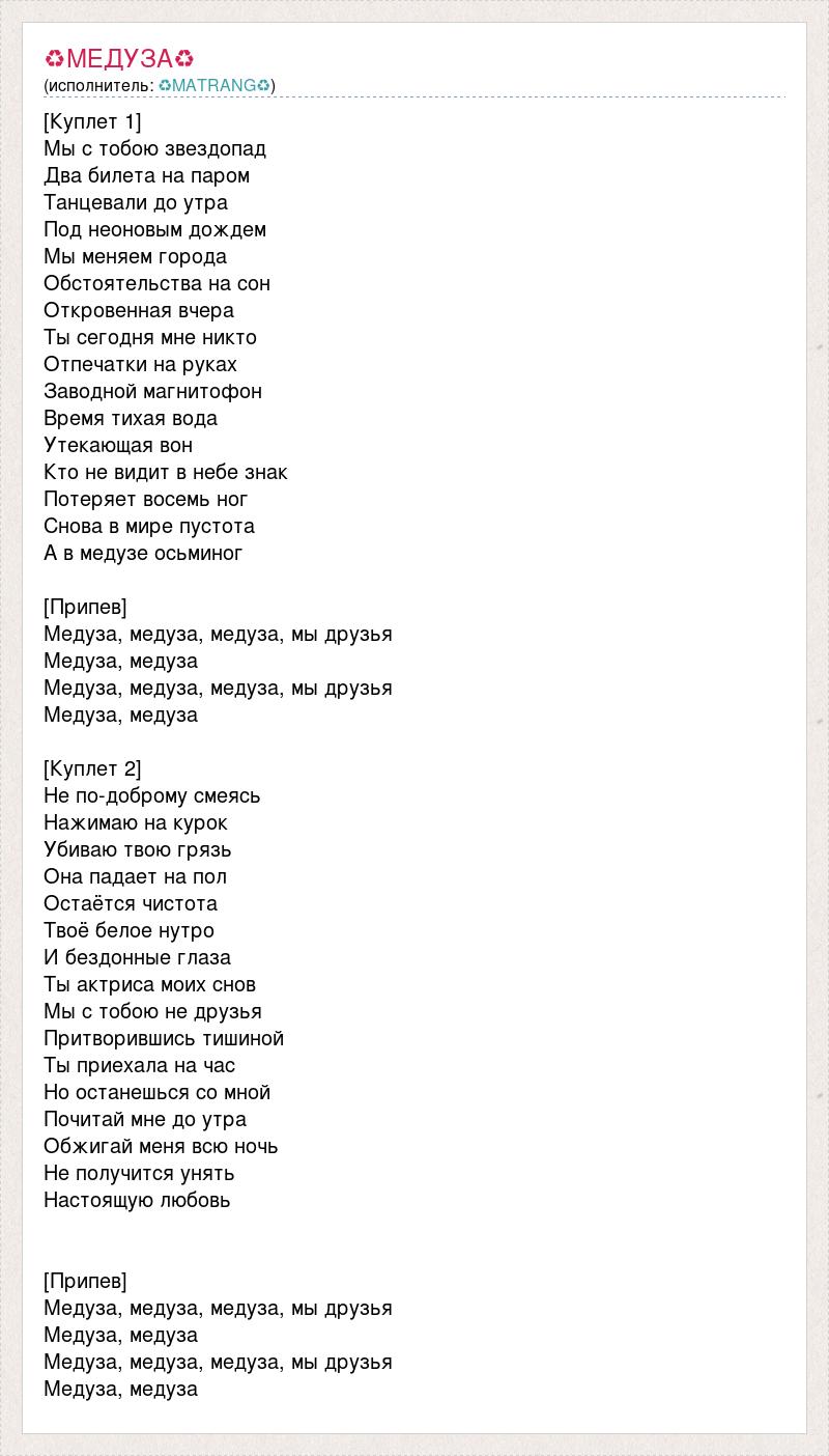 [Куплет 1] Мы с тобою звездопад Два билета на паром Танцевали до утра Под неоновым дождем Мы меняем города Обстоятельства на сон Откровенная вчера Ты сегодня мне никто Отпечатки на руках Заводной магнитофон Время тихая вода Утекающая вон Кто не видит в небе знак Потеряет восемь ног Снова в мире пустота А в медузе осьминог [Припев] Медуза, медуза, медуза, мы друзья Медуза, медуза Медуза, медуза, медуза, мы друзья Медуза, медуза [Куплет 2] Не по-доброму смеясь Нажимаю на курок Убиваю твою грязь Она падает на пол Остаётся чистота Твоё белое нутро И бездонные глаза Ты актриса моих снов Мы с тобою не друзья Притворившись тишиной Ты приехала на час Но останешься со мной Почитай мне до утра Обжигай меня всю ночь Не получится унять Настоящую любовь [Припев] Медуза, медуза, медуза, мы друзья Медуза, медуза Медуза, медуза, медуза, мы друзья Медуза, медуза