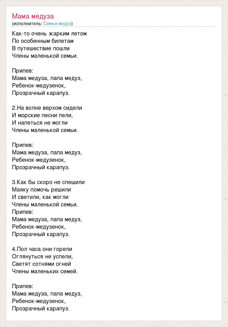 Как-то очень жарким летом По особенным билетам В путешествие пошли Члены маленькой семьи. Припев: Мама медуза, папа медуз, Ребенок-медузенок, Прозрачный карапуз. 2.На волне верхом сидели И морские песни пели, И напеться не могли Члены маленькой семьи. Припев: Мама медуза, папа медуз, Ребенок-медузенок, Прозрачный карапуз. 3.Как бы скоро не спешили Маяку помочь решили И светили, как могли Члены маленькой семьи. Припев: Мама медуза, папа медуз, Ребенок-медузенок, Прозрачный карапуз. 4.Пол часа они горели Оглянуться не успели, Светят сотнями огней Члены маленьких семей. Припев: Мама медуза, папа медуз, Ребенок-медузенок, Прозрачный карапуз.