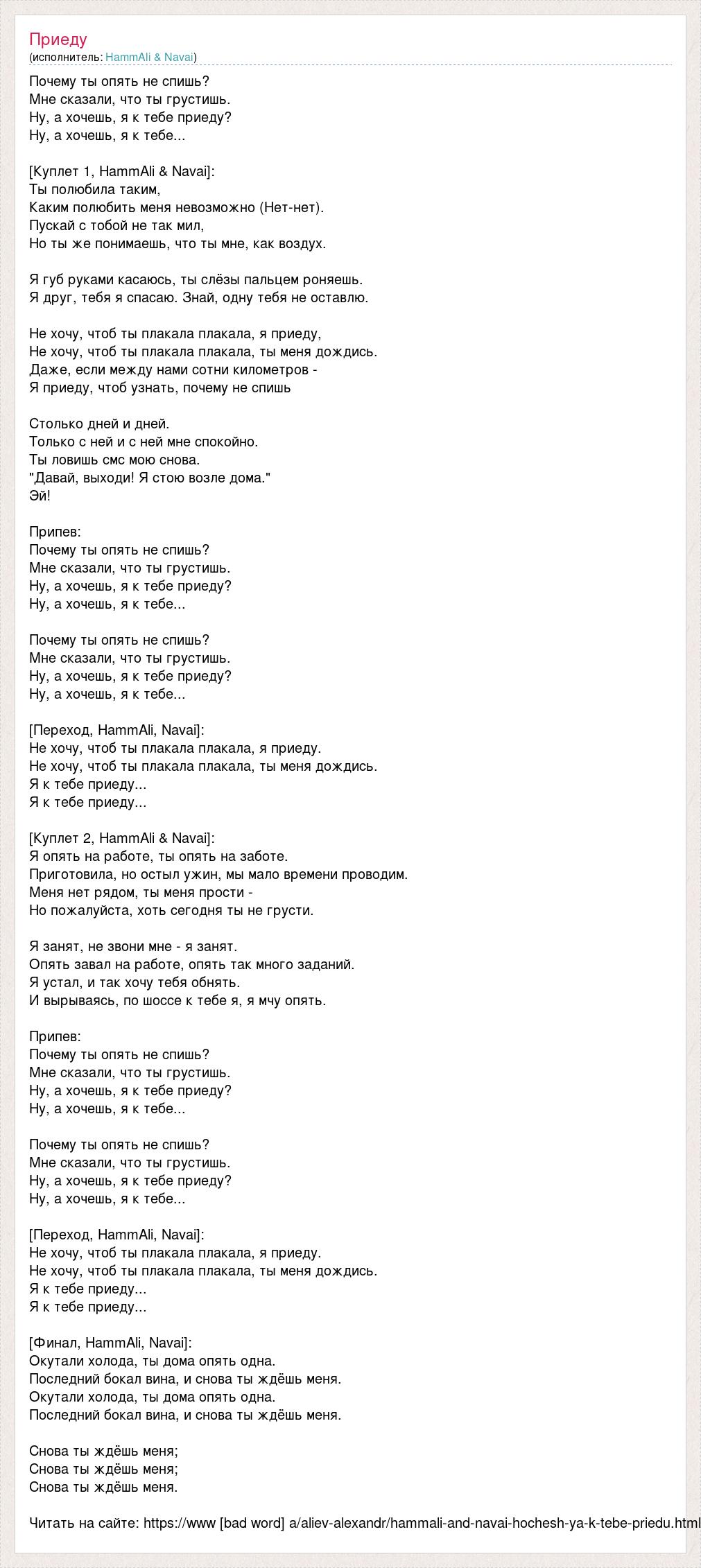 Почему ты опять не спишь? Мне сказали, что ты грустишь. Ну, а хочешь, я к тебе приеду? Ну, а хочешь, я к тебе... [Куплет 1, HammAli & Navai]: Ты полюбила таким, Каким полюбить меня невозможно (Нет-нет). Пускай с тобой не так мил, Но ты же понимаешь, что ты мне, как воздух. Я губ руками касаюсь, ты слёзы пальцем роняешь. Я друг, тебя я спасаю. Знай, одну тебя не оставлю. Не хочу, чтоб ты плакала плакала, я приеду, Не хочу, чтоб ты плакала плакала, ты меня дождись. Даже, если между нами сотни километров - Я приеду, чтоб узнать, почему не спишь Столько дней и дней. Только с ней и с ней мне спокойно. Ты ловишь смс мою снова. "Давай, выходи! Я стою возле дома." Эй! Припев: Почему ты опять не спишь? Мне сказали, что ты грустишь. Ну, а хочешь, я к тебе приеду? Ну, а хочешь, я к тебе... Почему ты опять не спишь? Мне сказали, что ты грустишь. Ну, а хочешь, я к тебе приеду? Ну, а хочешь, я к тебе... [Переход, HammAli, Navai]: Не хочу, чтоб ты плакала плакала, я приеду. Не хочу, чтоб ты плакала плакала, ты меня дождись. Я к тебе приеду... Я к тебе приеду... [Куплет 2, HammAli & Navai]: Я опять на работе, ты опять на заботе. Приготовила, но остыл ужин, мы мало времени проводим. Меня нет рядом, ты меня прости - Но пожалуйста, хоть сегодня ты не грусти. Я занят, не звони мне - я занят. Опять завал на работе, опять так много заданий. Я устал, и так хочу тебя обнять. И вырываясь, по шоссе к тебе я, я мчу опять. Припев: Почему ты опять не спишь? Мне сказали, что ты грустишь. Ну, а хочешь, я к тебе приеду? Ну, а хочешь, я к тебе... Почему ты опять не спишь? Мне сказали, что ты грустишь. Ну, а хочешь, я к тебе приеду? Ну, а хочешь, я к тебе... [Переход, HammAli, Navai]: Не хочу, чтоб ты плакала плакала, я приеду. Не хочу, чтоб ты плакала плакала, ты меня дождись. Я к тебе приеду... Я к тебе приеду... [Финал, HammAli, Navai]: Окутали холода, ты дома опять одна. Последний бокал вина, и снова ты ждёшь меня. Окутали холода, ты дома опять одна. Последний бокал вина, и снова ты ждёшь меня. Снова ты ждёшь меня; Снова ты ждёшь меня; Снова ты ждёшь меня. Читать на сайте: https://www [bad word] a/aliev-alexandr/hammali-and-navai-hochesh-ya-k-tebe-priedu.html