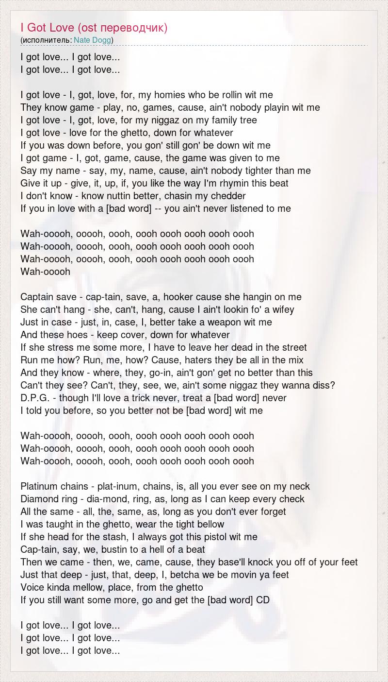 I got love... I got love... I got love... I got love... I got love - I, got, love, for, my homies who be rollin wit me They know game - play, no, games, cause, ain't nobody playin wit me I got love - I, got, love, for my niggaz on my family tree I got love - love for the ghetto, down for whatever If you was down before, you gon' still gon' be down wit me I got game - I, got, game, cause, the game was given to me Say my name - say, my, name, cause, ain't nobody tighter than me Give it up - give, it, up, if, you like the way I'm rhymin this beat I don't know - know nuttin better, chasin my chedder If you in love with a [bad word] -- you ain't never listened to me Wah-ooooh, ooooh, oooh, oooh oooh oooh oooh oooh Wah-ooooh, ooooh, oooh, oooh oooh oooh oooh oooh Wah-ooooh, ooooh, oooh, oooh oooh oooh oooh oooh Wah-ooooh Captain save - cap-tain, save, a, hooker cause she hangin on me She can't hang - she, can't, hang, cause I ain't lookin fo' a wifey Just in case - just, in, case, I, better take a weapon wit me And these hoes - keep cover, down for whatever If she stress me some more, I have to leave her dead in the street Run me how? Run, me, how? Cause, haters they be all in the mix And they know - where, they, go-in, ain't gon' get no better than this Can't they see? Can't, they, see, we, ain't some niggaz they wanna diss? D.P.G. - though I'll love a trick never, treat a [bad word] never I told you before, so you better not be [bad word] wit me Wah-ooooh, ooooh, oooh, oooh oooh oooh oooh oooh Wah-ooooh, ooooh, oooh, oooh oooh oooh oooh oooh Wah-ooooh, ooooh, oooh, oooh oooh oooh oooh oooh Platinum chains - plat-inum, chains, is, all you ever see on my neck Diamond ring - dia-mond, ring, as, long as I can keep every check All the same - all, the, same, as, long as you don't ever forget I was taught in the ghetto, wear the tight bellow If she head for the stash, I always got this pistol wit me Cap-tain, say, we, bustin to a hell of a beat Then we came - then, we, came, cause, they base'll knock you off of your feet Just that deep - just, that, deep, I, betcha we be movin ya feet Voice kinda mellow, place, from the ghetto If you still want some more, go and get the [bad word] CD I got love... I got love... I got love... I got love... I got love... I got love...