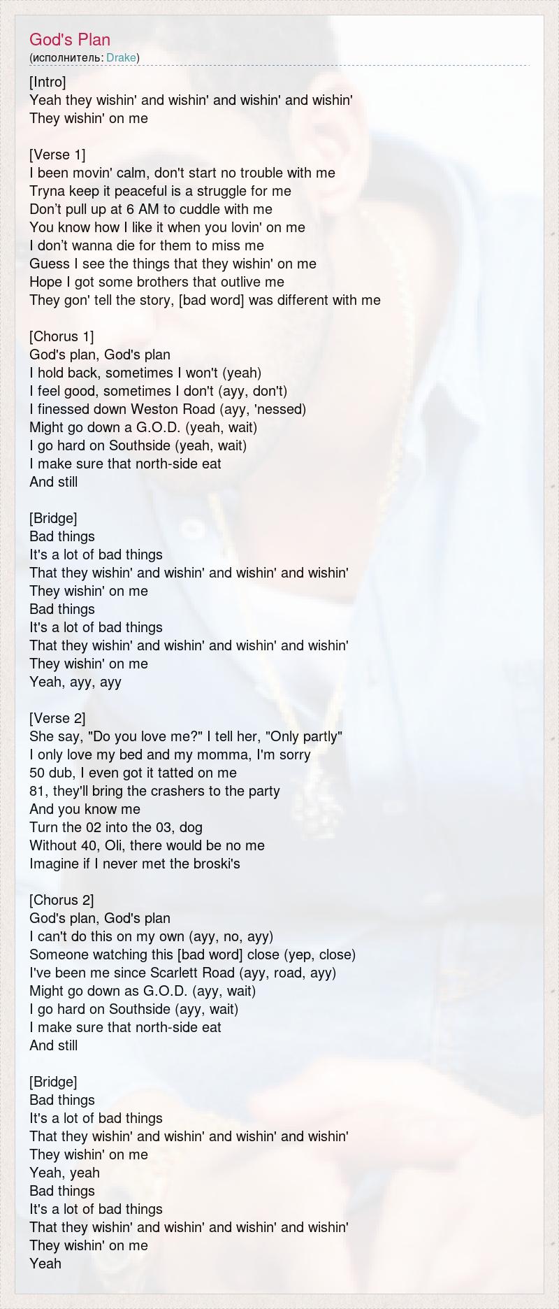 [Intro] Yeah they wishin' and wishin' and wishin' and wishin' They wishin' on me [Verse 1] I been movin' calm, don't start no trouble with me Tryna keep it peaceful is a struggle for me Don’t pull up at 6 AM to cuddle with me You know how I like it when you lovin' on me I don’t wanna die for them to miss me Guess I see the things that they wishin' on me Hope I got some brothers that outlive me They gon' tell the story, [bad word] was different with me [Chorus 1] God's plan, God's plan I hold back, sometimes I won't (yeah) I feel good, sometimes I don't (ayy, don't) I finessed down Weston Road (ayy, 'nessed) Might go down a G.O.D. (yeah, wait) I go hard on Southside (yeah, wait) I make sure that north-side eat And still [Bridge] Bad things It's a lot of bad things That they wishin' and wishin' and wishin' and wishin' They wishin' on me Bad things It's a lot of bad things That they wishin' and wishin' and wishin' and wishin' They wishin' on me Yeah, ayy, ayy [Verse 2] She say, "Do you love me?" I tell her, "Only partly" I only love my bed and my momma, I'm sorry 50 dub, I even got it tatted on me 81, they'll bring the crashers to the party And you know me Turn the 02 into the 03, dog Without 40, Oli, there would be no me Imagine if I never met the broski's [Chorus 2] God's plan, God's plan I can't do this on my own (ayy, no, ayy) Someone watching this [bad word] close (yep, close) I've been me since Scarlett Road (ayy, road, ayy) Might go down as G.O.D. (ayy, wait) I go hard on Southside (ayy, wait) I make sure that north-side eat And still [Bridge] Bad things It's a lot of bad things That they wishin' and wishin' and wishin' and wishin' They wishin' on me Yeah, yeah Bad things It's a lot of bad things That they wishin' and wishin' and wishin' and wishin' They wishin' on me Yeah