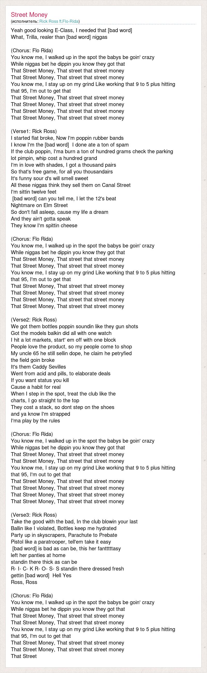 Yeah good looking E-Class, I needed that [bad word] What, Trilla, realer than [bad word] niggas (Chorus: Flo Rida) You know me, I walked up in the spot the babys be goin' crazy While niggas bet he dippin you know they got that That Street Money, That street that street money That Street Money, That street that street money You know me, I stay up on my grind Like working that 9 to 5 plus hitting that 95, I'm out to get that That Street Money, That street that street money That Street Money, That street that street money That Street Money, That street that street money That Street Money, That street that street money (Verse1: Rick Ross) I started flat broke, Now I'm poppin rubber bands I know I'm the [bad word] I done ate a ton of spam If the club poppin, I'ma burn a ton of hundred grams check the parking lot pimpin, whip cost a hundred grand I'm in love with shades, I got a thousand pairs So that's free game, for all you thousandairs It's funny sour d's will smell sweet All these niggas think they sell them on Canal Street I'm sittin twelve feet [bad word] can you tell me, I let the 12's beat Nightmare on Elm Street So don't fall asleep, cause my life a dream And they ain't gotta speak They know I'm spittin cheese (Chorus: Flo Rida) You know me, I walked up in the spot the babys be goin' crazy While niggas bet he dippin you know they got that That Street Money, That street that street money That Street Money, That street that street money You know me, I stay up on my grind Like working that 9 to 5 plus hitting that 95, I'm out to get that That Street Money, That street that street money That Street Money, That street that street money That Street Money, That street that street money That Street Money, That street that street money (Verse2: Rick Ross) We got them bottles poppin soundin like they gun shots Got the models balkin did all with one watch I hit a lot markets, start' em off with one block People love the product, so my people come to shop My uncle 65 he still sellin dope, he claim he petryfied the field goin broke It's them Caddy Sevilles Went from acid and pills, to elaborate deals If you want status you kill Cause a habit for real When I step in the spot, treat the club like the charts, I go straight to the top They cost a stack, so dont step on the shoes and ya know I'm strapped I'ma play by the rules (Chorus: Flo Rida) You know me, I walked up in the spot the babys be goin' crazy While niggas bet he dippin you know they got that That Street Money, That street that street money That Street Money, That street that street money You know me, I stay up on my grind Like working that 9 to 5 plus hitting that 95, I'm out to get that That Street Money, That street that street money That Street Money, That street that street money That Street Money, That street that street money That Street Money, That street that street money (Verse3: Rick Ross) Take the good with the bad, In the club blowin your last Ballin like I violated, Bottles keep me hydrated Party up in skyscrapers, Parachute to Prebate Pistol like a paratrooper, tell'em take it easy [bad word] is bad as can be, this her fantttttasy left her panties at home standin there thick as can be R- I- C- K R- O- S- S standin there dressed fresh gettin [bad word] Hell Yes Ross, Ross (Chorus: Flo Rida) You know me, I walked up in the spot the babys be goin' crazy While niggas bet he dippin you know they got that That Street Money, That street that street money That Street Money, That street that street money You know me, I stay up on my grind Like working that 9 to 5 plus hitting that 95, I'm out to get that That Street Money, That street that street money That Street Money, That street that street money That Street