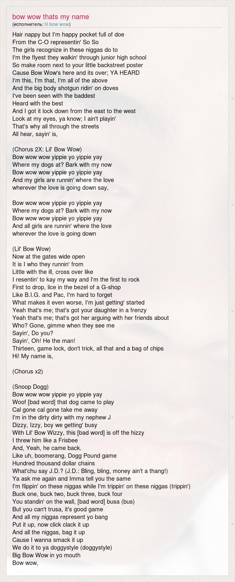 Hair nappy but I'm happy pocket full of doe From the C-O representin' So So The girls recognize in these niggas do to I'm the flyest they walkin' through junior high school So make room next to your little backstreet poster Cause Bow Wow's here and its over; YA HEARD I'm this, I'm that, I'm all of the above And the big body shotgun ridin' on doves I've been seen with the baddest Heard with the best And I got it lock down from the east to the west Look at my eyes, ya know; I ain't playin' That's why all through the streets All hear, sayin' is, (Chorus 2X: Lil' Bow Wow) Bow wow wow yippie yo yippie yay Where my dogs at? Bark with my now Bow wow wow yippie yo yippie yay And my girls are runnin' where the love wherever the love is going down say, Bow wow wow yippie yo yippie yay Where my dogs at? Bark with my now Bow wow wow yippie yo yippie yay And all girls are runnin' where the love wherever the love is going down (Lil' Bow Wow) Now at the gates wide open It is I who they runnin' from Little with the ill, cross over like I resentin' to kay my way and I'm the first to rock First to drop, lice in the bezel of a G-shop Like B.I.G. and Pac, I'm hard to forget What makes it even worse, I'm just getting' started Yeah that's me; that's got your daughter in a frenzy Yeah that's me; that's got her arguing with her friends about Who? Gone, gimme when they see me Sayin', Do you? Sayin', Oh! He the man! Thirteen, game lock, don't trick, all that and a bag of chips Hi! My name is, (Chorus x2) (Snoop Dogg) Bow wow wow yippie yo yippie yay Woof [bad word] that dog came to play Cal gone cal gone take me away I'm in the dirty dirty with my nephew J Dizzy, Izzy, boy we getting' busy With Lil' Bow Wizzy, this [bad word] is off the hizzy I threw him like a Frisbee And, Yeah, he came back. Like uh, boomerang, Dogg Pound game Hundred thousand dollar chains What'chu say J.D.? (J.D.: Bling, bling, money ain't a thang!) Ya ask me again and Imma tell you the same I'm flippin' on these niggas while I'm trippin' on these niggas (trippin') Buck one, buck two, buck three, buck four You standin' on the wall, [bad word] busa (bus) But you can't trusa, it's good game And all my niggas represent yo bang Put it up, now click clack it up And all the niggas, bag it up Cause I wanna smack it up We do it to ya doggystyle (doggystyle) Big Bow Wow in yo mouth Bow wow,