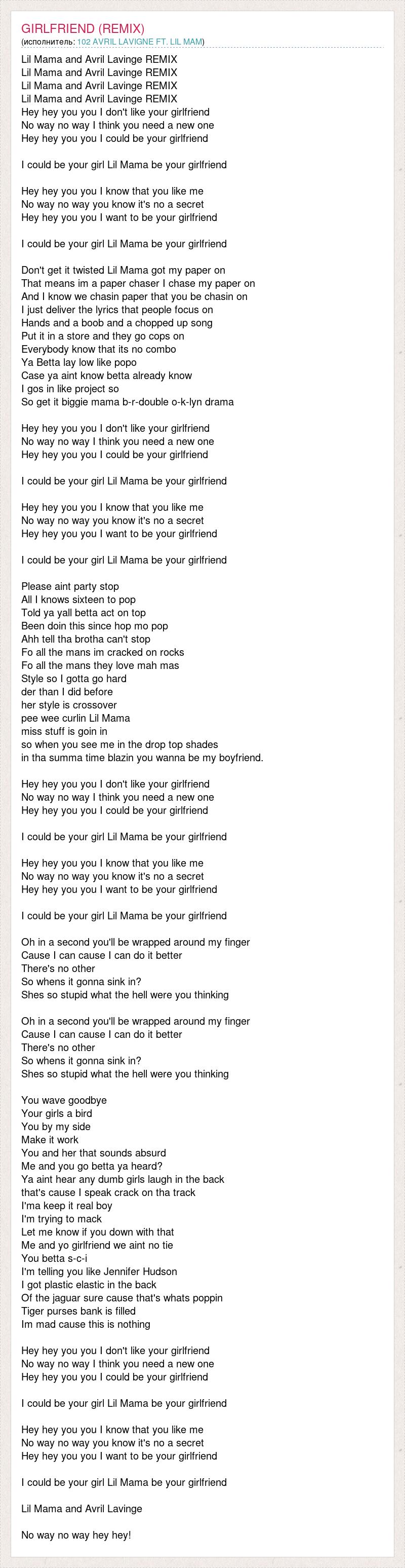 Lil Mama and Avril Lavinge REMIX Lil Mama and Avril Lavinge REMIX Lil Mama and Avril Lavinge REMIX Lil Mama and Avril Lavinge REMIX Hey hey you you I don't like your girlfriend No way no way I think you need a new one Hey hey you you I could be your girlfriend I could be your girl Lil Mama be your girlfriend Hey hey you you I know that you like me No way no way you know it's no a secret Hey hey you you I want to be your girlfriend I could be your girl Lil Mama be your girlfriend Don't get it twisted Lil Mama got my paper on That means im a paper chaser I chase my paper on And I know we chasin paper that you be chasin on I just deliver the lyrics that people focus on Hands and a boob and a chopped up song Put it in a store and they go cops on Everybody know that its no combo Ya Betta lay low like popo Case ya aint know betta already know I gos in like project so So get it biggie mama b-r-double o-k-lyn drama Hey hey you you I don't like your girlfriend No way no way I think you need a new one Hey hey you you I could be your girlfriend I could be your girl Lil Mama be your girlfriend Hey hey you you I know that you like me No way no way you know it's no a secret Hey hey you you I want to be your girlfriend I could be your girl Lil Mama be your girlfriend Please aint party stop All I knows sixteen to pop Told ya yall betta act on top Been doin this since hop mo pop Ahh tell tha brotha can't stop Fo all the mans im cracked on rocks Fo all the mans they love mah mas Style so I gotta go hard der than I did before her style is crossover pee wee curlin Lil Mama miss stuff is goin in so when you see me in the drop top shades in tha summa time blazin you wanna be my boyfriend. Hey hey you you I don't like your girlfriend No way no way I think you need a new one Hey hey you you I could be your girlfriend I could be your girl Lil Mama be your girlfriend Hey hey you you I know that you like me No way no way you know it's no a secret Hey hey you you I want to be your girlfriend I could be your girl Lil Mama be your girlfriend Oh in a second you'll be wrapped around my finger Cause I can cause I can do it better There's no other So whens it gonna sink in? Shes so stupid what the hell were you thinking Oh in a second you'll be wrapped around my finger Cause I can cause I can do it better There's no other So whens it gonna sink in? Shes so stupid what the hell were you thinking You wave goodbye Your girls a bird You by my side Make it work You and her that sounds absurd Me and you go betta ya heard? Ya aint hear any dumb girls laugh in the back that's cause I speak crack on tha track I'ma keep it real boy I'm trying to mack Let me know if you down with that Me and yo girlfriend we aint no tie You betta s-c-i I'm telling you like Jennifer Hudson I got plastic elastic in the back Of the jaguar sure cause that's whats poppin Tiger purses bank is filled Im mad cause this is nothing Hey hey you you I don't like your girlfriend No way no way I think you need a new one Hey hey you you I could be your girlfriend I could be your girl Lil Mama be your girlfriend Hey hey you you I know that you like me No way no way you know it's no a secret Hey hey you you I want to be your girlfriend I could be your girl Lil Mama be your girlfriend Lil Mama and Avril Lavinge No way no way hey hey!