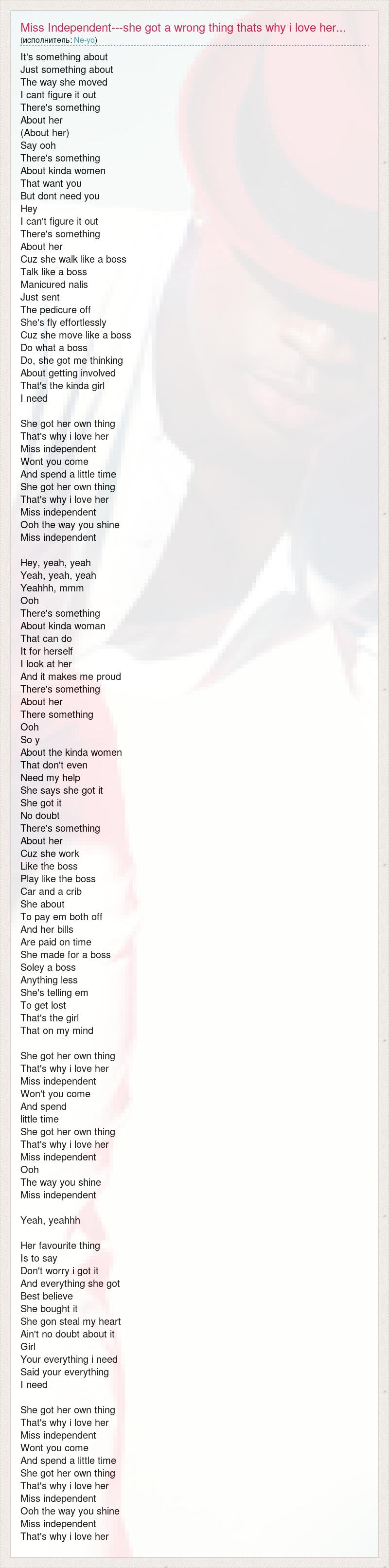 It's something about Just something about The way she moved I cant figure it out There's something About her (About her) Say ooh There's something About kinda women That want you But dont need you Hey I can't figure it out There's something About her Cuz she walk like a boss Talk like a boss Manicured nalis Just sent The pedicure off She's fly effortlessly Cuz she move like a boss Do what a boss Do, she got me thinking About getting involved That's the kinda girl I need She got her own thing That's why i love her Miss independent Wont you come And spend a little time She got her own thing That's why i love her Miss independent Ooh the way you shine Miss independent Hey, yeah, yeah Yeah, yeah, yeah Yeahhh, mmm Ooh There's something About kinda woman That can do It for herself I look at her And it makes me proud There's something About her There something Ooh So y About the kinda women That don't even Need my help She says she got it She got it No doubt There's something About her Cuz she work Like the boss Play like the boss Car and a crib She about To pay em both off And her bills Are paid on time She made for a boss Soley a boss Anything less She's telling em To get lost That's the girl That on my mind She got her own thing That's why i love her Miss independent Won't you come And spend little time She got her own thing That's why i love her Miss independent Ooh The way you shine Miss independent Yeah, yeahhh Her favourite thing Is to say Don't worry i got it And everything she got Best believe She bought it She gon steal my heart Ain't no doubt about it Girl Your everything i need Said your everything I need She got her own thing That's why i love her Miss independent Wont you come And spend a little time She got her own thing That's why i love her Miss independent Ooh the way you shine Miss independent That's why i love her