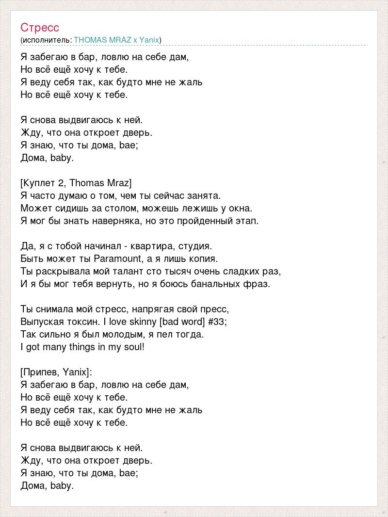 Я забегаю в бар, ловлю на себе дам, Но всё ещё хочу к тебе. Я веду себя так, как будто мне не жаль Но всё ещё хочу к тебе. Я снова выдвигаюсь к ней. Жду, что она откроет дверь. Я знаю, что ты дома, bae; Дома, baby. [Куплет 2, Thomas Mraz] Я часто думаю о том, чем ты сейчас занята. Может сидишь за столом, можешь лежишь у окна. Я мог бы знать наверняка, но это пройденный этап. Да, я с тобой начинал - квартира, студия. Быть может ты Paramount, а я лишь копия. Ты раскрывала мой талант сто тысяч очень сладких раз, И я бы мог тебя вернуть, но я боюсь банальных фраз. Ты снимала мой стресс, напрягая свой пресс, Выпуская токсин. I love skinny [bad word] #33; Так сильно я был молодым, я пел тогда. I got many things in my soul! [Припев, Yanix]: Я забегаю в бар, ловлю на себе дам, Но всё ещё хочу к тебе. Я веду себя так, как будто мне не жаль Но всё ещё хочу к тебе. Я снова выдвигаюсь к ней. Жду, что она откроет дверь. Я знаю, что ты дома, bae; Дома, baby.