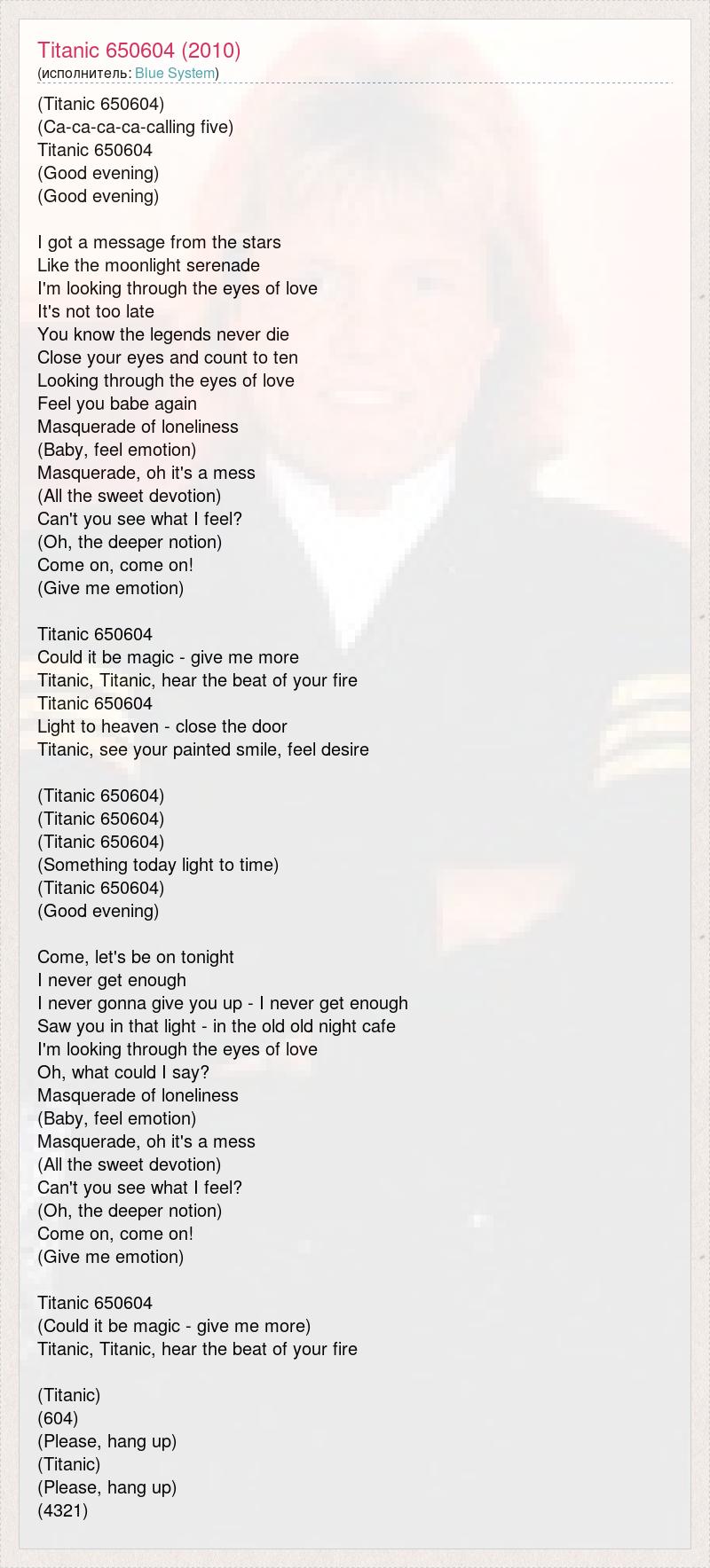 (Titanic 650604) (Ca-ca-ca-ca-calling five) Titanic 650604 (Good evening) (Good evening) I got a message from the stars Like the moonlight serenade I'm looking through the eyes of love It's not too late You know the legends never die Close your eyes and count to ten Looking through the eyes of love Feel you babe again Masquerade of loneliness (Baby, feel emotion) Masquerade, oh it's a mess (All the sweet devotion) Can't you see what I feel? (Oh, the deeper notion) Come on, come on! (Give me emotion) Titanic 650604 Could it be magic - give me more Titanic, Titanic, hear the beat of your fire Titanic 650604 Light to heaven - close the door Titanic, see your painted smile, feel desire (Titanic 650604) (Titanic 650604) (Titanic 650604) (Something today light to time) (Titanic 650604) (Good evening) Come, let's be on tonight I never get enough I never gonna give you up - I never get enough Saw you in that light - in the old old night cafe I'm looking through the eyes of love Oh, what could I say? Masquerade of loneliness (Baby, feel emotion) Masquerade, oh it's a mess (All the sweet devotion) Can't you see what I feel? (Oh, the deeper notion) Come on, come on! (Give me emotion) Titanic 650604 (Could it be magic - give me more) Titanic, Titanic, hear the beat of your fire (Titanic) (604) (Please, hang up) (Titanic) (Please, hang up) (4321)