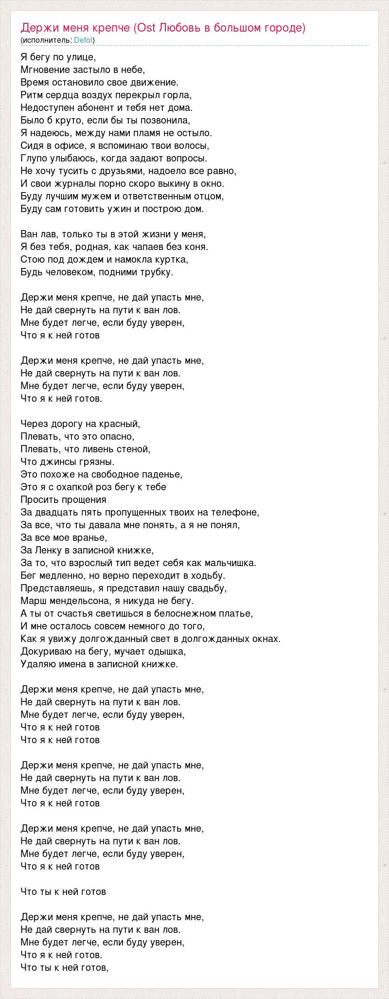 Я бегу по улице, Мгновение застыло в небе, Время остановило свое движение. Ритм сердца воздух перекрыл горла, Недоступен абонент и тебя нет дома. Было б круто, если бы ты позвонила, Я надеюсь, между нами пламя не остыло. Сидя в офисе, я вспоминаю твои волосы, Глупо улыбаюсь, когда задают вопросы. Не хочу тусить с друзьями, надоело все равно, И свои журналы порно скоро выкину в окно. Буду лучшим мужем и ответственным отцом, Буду сам готовить ужин и построю дом. Ван лав, только ты в этой жизни у меня, Я без тебя, родная, как чапаев без коня. Стою под дождем и намокла куртка, Будь человеком, подними трубку. Держи меня крепче, не дай упасть мне, Не дай свернуть на пути к ван лов. Мне будет легче, если буду уверен, Что я к ней готов Держи меня крепче, не дай упасть мне, Не дай свернуть на пути к ван лов. Мне будет легче, если буду уверен, Что я к ней готов. Через дорогу на красный, Плевать, что это опасно, Плевать, что ливень стеной, Что джинсы грязны. Это похоже на свободное паденье, Это я с охапкой роз бегу к тебе Просить прощения За двадцать пять пропущенных твоих на телефоне, За все, что ты давала мне понять, а я не понял, За все мое вранье, За Ленку в записной книжке, За то, что взрослый тип ведет себя как мальчишка. Бег медленно, но верно переходит в ходьбу. Представляешь, я представил нашу свадьбу, Марш мендельсона, я никуда не бегу. А ты от счастья светишься в белоснежном платье, И мне осталось совсем немного до того, Как я увижу долгожданный свет в долгожданных окнах. Докуриваю на бегу, мучает одышка, Удаляю имена в записной книжке. Держи меня крепче, не дай упасть мне, Не дай свернуть на пути к ван лов. Мне будет легче, если буду уверен, Что я к ней готов Что я к ней готов Держи меня крепче, не дай упасть мне, Не дай свернуть на пути к ван лов. Мне будет легче, если буду уверен, Что я к ней готов Держи меня крепче, не дай упасть мне, Не дай свернуть на пути к ван лов. Мне будет легче, если буду уверен, Что я к ней готов Что ты к ней готов Держи меня крепче, не дай упасть мне, Не дай свернуть на пути к ван лов. Мне будет легче, если буду уверен, Что я к ней готов. Что ты к ней готов,