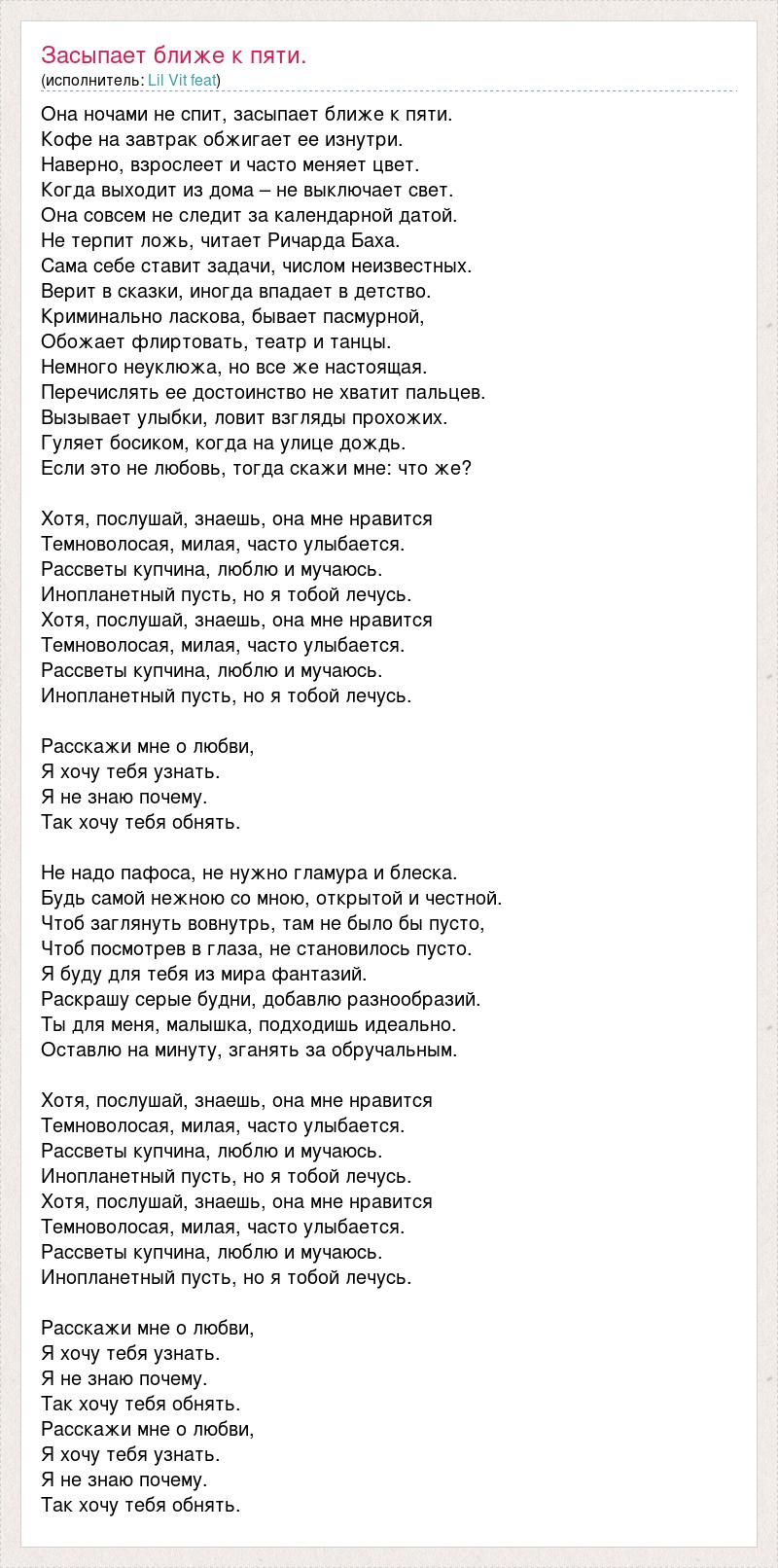 Она ночами не спит, засыпает ближе к пяти. Кофе на завтрак обжигает ее изнутри. Наверно, взрослеет и часто меняет цвет. Когда выходит из дома – не выключает свет. Она совсем не следит за календарной датой. Не терпит ложь, читает Ричарда Баха. Сама себе ставит задачи, числом неизвестных. Верит в сказки, иногда впадает в детство. Криминально ласкова, бывает пасмурной, Обожает флиртовать, театр и танцы. Немного неуклюжа, но все же настоящая. Перечислять ее достоинство не хватит пальцев. Вызывает улыбки, ловит взгляды прохожих. Гуляет босиком, когда на улице дождь. Если это не любовь, тогда скажи мне: что же? Хотя, послушай, знаешь, она мне нравится Темноволосая, милая, часто улыбается. Рассветы купчина, люблю и мучаюсь. Инопланетный пусть, но я тобой лечусь. Хотя, послушай, знаешь, она мне нравится Темноволосая, милая, часто улыбается. Рассветы купчина, люблю и мучаюсь. Инопланетный пусть, но я тобой лечусь. Расскажи мне о любви, Я хочу тебя узнать. Я не знаю почему. Так хочу тебя обнять. Не надо пафоса, не нужно гламура и блеска. Будь самой нежною со мною, открытой и честной. Чтоб заглянуть вовнутрь, там не было бы пусто, Чтоб посмотрев в глаза, не становилось пусто. Я буду для тебя из мира фантазий. Раскрашу серые будни, добавлю разнообразий. Ты для меня, малышка, подходишь идеально. Оставлю на минуту, зганять за обручальным. Хотя, послушай, знаешь, она мне нравится Темноволосая, милая, часто улыбается. Рассветы купчина, люблю и мучаюсь. Инопланетный пусть, но я тобой лечусь. Хотя, послушай, знаешь, она мне нравится Темноволосая, милая, часто улыбается. Рассветы купчина, люблю и мучаюсь. Инопланетный пусть, но я тобой лечусь. Расскажи мне о любви, Я хочу тебя узнать. Я не знаю почему. Так хочу тебя обнять. Расскажи мне о любви, Я хочу тебя узнать. Я не знаю почему. Так хочу тебя обнять.