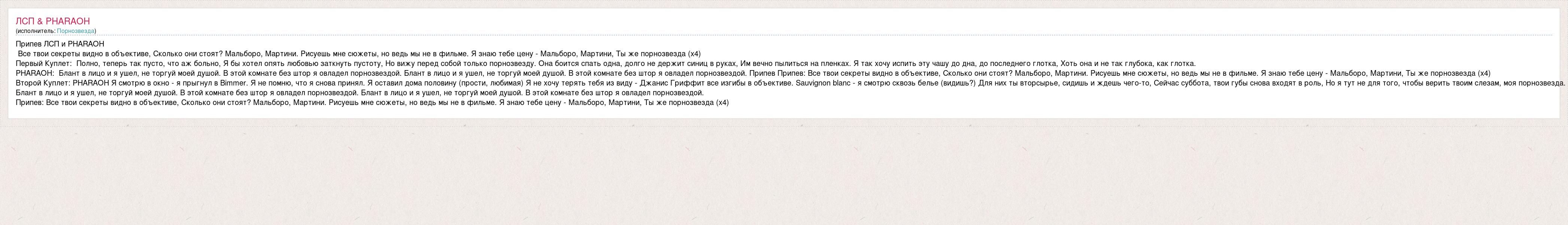 Припев ЛСП и PHARAOH Все твои секреты видно в объективе, Сколько они стоят? Мальборо, Мартини. Рисуешь мне сюжеты, но ведь мы не в фильме. Я знаю тебе цену - Мальборо, Мартини, Ты же порнозвезда (х4) Первый Куплет: Полно, теперь так пусто, что аж больно, Я бы хотел опять любовью заткнуть пустоту, Но вижу перед собой только порнозвезду. Она боится спать одна, долго не держит синиц в руках, Им вечно пылиться на пленках. Я так хочу испить эту чашу до дна, до последнего глотка, Хоть она и не так глубока, как глотка. PHARAOH: Блант в лицо и я ушел, не торгуй моей душой. В этой комнате без штор я овладел порнозвездой. Блант в лицо и я ушел, не торгуй моей душой. В этой комнате без штор я овладел порнозвездой. Припев Припев: Все твои секреты видно в объективе, Сколько они стоят? Мальборо, Мартини. Рисуешь мне сюжеты, но ведь мы не в фильме. Я знаю тебе цену - Мальборо, Мартини, Ты же порнозвезда (х4) Второй Куплет: PHARAOH Я смотрю в окно - я прыгнул в Bimmer. Я не помню, что я снова принял. Я оставил дома половину (прости, любимая) Я не хочу терять тебя из виду - Джанис Гриффит все изгибы в объективе. Sauvignon blanc - я смотрю сквозь белье (видишь?) Для них ты вторсырье, сидишь и ждешь чего-то, Сейчас суббота, твои губы снова входят в роль, Но я тут не для того, чтобы верить твоим слезам, моя порнозвезда. Блант в лицо и я ушел, не торгуй моей душой. В этой комнате без штор я овладел порнозвездой. Блант в лицо и я ушел, не торгуй моей душой. В этой комнате без штор я овладел порнозвездой. Припев: Все твои секреты видно в объективе, Сколько они стоят? Мальборо, Мартини. Рисуешь мне сюжеты, но ведь мы не в фильме. Я знаю тебе цену - Мальборо, Мартини, Ты же порнозвезда (х4)