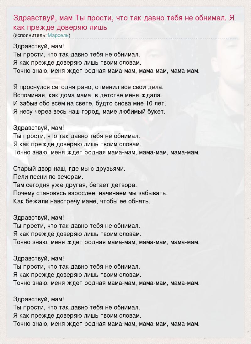 Здравствуй, мам! Ты прости, что так давно тебя не обнимал. Я как прежде доверяю лишь твоим словам. Точно знаю, меня ждет родная мама-мам, мама-мам, мама-мам. Я проснулся сегодня рано, отменил все свои дела. Вспоминая, как дома мама, в детстве меня ждала. И забыв обо всём на свете, будто снова мне 10 лет. Я несу через весь наш город, маме любимый букет. Здравствуй, мам! Ты прости, что так давно тебя не обнимал. Я как прежде доверяю лишь твоим словам. Точно знаю, меня ждет родная мама-мам, мама-мам, мама-мам. Старый двор наш, где мы с друзьями. Пели песни по вечерам. Там сегодня уже другая, бегает детвора. Почему становясь взрослее, начинаем мы забывать. Как бежали навстречу маме, чтобы её обнять. Здравствуй, мам! Ты прости, что так давно тебя не обнимал. Я как прежде доверяю лишь твоим словам. Точно знаю, меня ждет родная мама-мам, мама-мам, мама-мам. Здравствуй, мам! Ты прости, что так давно тебя не обнимал. Я как прежде доверяю лишь твоим словам. Точно знаю, меня ждет родная мама-мам, мама-мам, мама-мам. Здравствуй, мам! Ты прости, что так давно тебя не обнимал. Я как прежде доверяю лишь твоим словам. Точно знаю, меня ждет родная мама-мам, мама-мам, мама-мам.