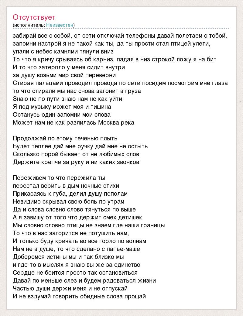 забирай все с собой, от сети отключай телефоны давай полетаем с тобой, запомни настрой я не такой как ты, да ты прости стая птицей улети, упали с небес камнями тянули вниз То что я кричу срываясь об карниз, падая в низ строкой ложу я на бит И то что затерпло у меня сидит внутри за душу возьми мир свой переверни Стирая пальцами проводил провода по сети посидим посмотрим мне глаза то что стирали мы нас снова загонит в груза Знаю не по пути знаю нам не как уйти Я под музыку может моя и тишина Останусь один запомни мои слова Может нам не как разлилась Москва река Продолжай по этому теченью плыть Будет теплее дай мне ручку дай мне не остыть Скользко порой бывает от не любимых слов Держите крепче за руку и ни каких звонков Переживем то что пережила ты перестал верить в дым ночные стихи Прикасаясь к губа, делил душу пополам Невидимо скрывал свою боль по утрам Да и слова словно слово тянуться по выше А я завишу от того что держит смех детишек Мы словно словно птицы не знаем где наши границы То что в нас загорится не потушить нам, И только буду кричать во все горло по волнам Нам не в душе, то что сделано с папье-маше Доберемся истины мы и так близко мы и где-то в мыслях я знаю вы же за единство Сердце не боится просто так остановиться Давай по меньше слез и будем радоваться жизни Частью души держи меня и не отпускай И не вздумай говорить обидные слова прощай