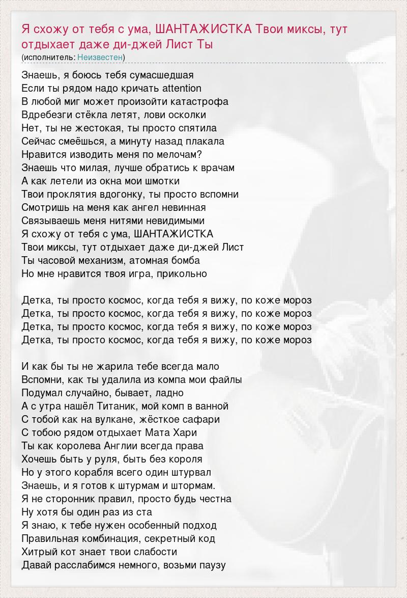 Знаешь, я боюсь тебя сумасшедшая Если ты рядом надо кричать attention В любой миг может произойти катастрофа Вдребезги стёкла летят, лови осколки Нет, ты не жестокая, ты просто спятила Сейчас смеёшься, а минуту назад плакала Нравится изводить меня по мелочам? Знаешь что милая, лучше обратись к врачам А как летели из окна мои шмотки Твои проклятия вдогонку, ты просто вспомни Смотришь на меня как ангел невинная Связываешь меня нитями невидимыми Я схожу от тебя с ума, ШАНТАЖИСТКА Твои миксы, тут отдыхает даже ди-джей Лист Ты часовой механизм, атомная бомба Но мне нравится твоя игра, прикольно Детка, ты просто космос, когда тебя я вижу, по коже мороз Детка, ты просто космос, когда тебя я вижу, по коже мороз Детка, ты просто космос, когда тебя я вижу, по коже мороз Детка, ты просто космос, когда тебя я вижу, по коже мороз И как бы ты не жарила тебе всегда мало Вспомни, как ты удалила из компа мои файлы Подумал случайно, бывает, ладно А с утра нашёл Титаник, мой комп в ванной С тобой как на вулкане, жёсткое сафари С тобою рядом отдыхает Мата Хари Ты как королева Англии всегда права Хочешь быть у руля, быть без короля Но у этого корабля всего один штурвал Знаешь, и я готов к штурмам и штормам. Я не сторонник правил, просто будь честна Ну хотя бы один раз из ста Я знаю, к тебе нужен особенный подход Правильная комбинация, секретный код Хитрый кот знает твои слабости Давай расслабимся немного, возьми паузу