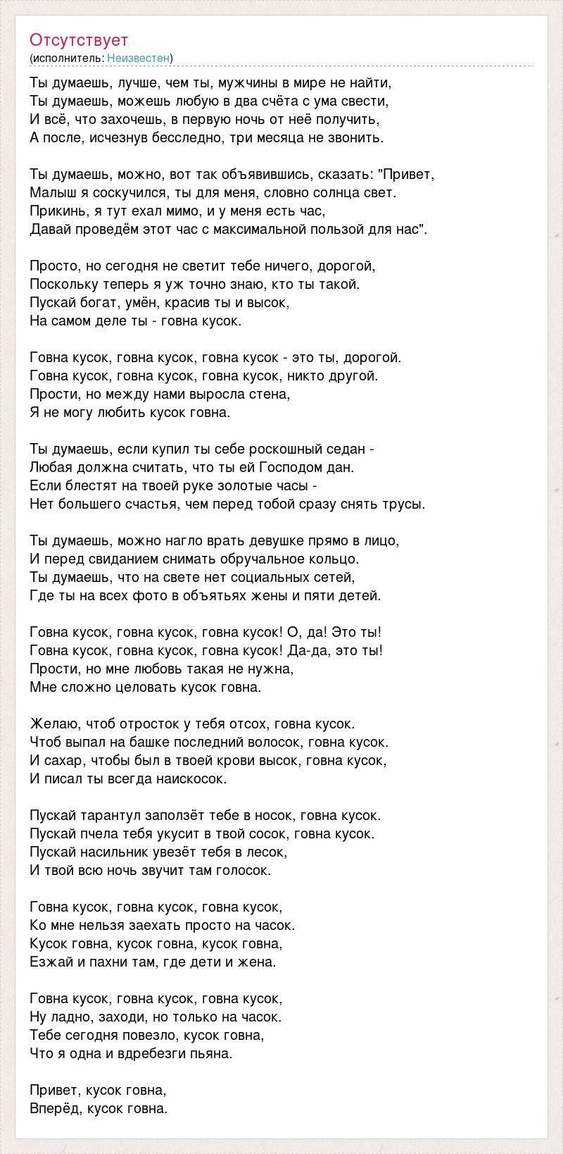 Ты думаешь, лучше, чем ты, мужчины в мире не найти, Ты думаешь, можешь любую в два счёта с ума свести, И всё, что захочешь, в первую ночь от неё получить, А после, исчезнув бесследно, три месяца не звонить. Ты думаешь, можно, вот так объявившись, сказать: "Привет, Малыш я соскучился, ты для меня, словно солнца свет. Прикинь, я тут ехал мимо, и у меня есть час, Давай проведём этот час с максимальной пользой для нас". Просто, но сегодня не светит тебе ничего, дорогой, Поскольку теперь я уж точно знаю, кто ты такой. Пускай богат, умён, красив ты и высок, На самом деле ты - говна кусок. Говна кусок, говна кусок, говна кусок - это ты, дорогой. Говна кусок, говна кусок, говна кусок, никто другой. Прости, но между нами выросла стена, Я не могу любить кусок говна. Ты думаешь, если купил ты себе роскошный седан - Любая должна считать, что ты ей Господом дан. Если блестят на твоей руке золотые часы - Нет большего счастья, чем перед тобой сразу снять трусы. Ты думаешь, можно нагло врать девушке прямо в лицо, И перед свиданием снимать обручальное кольцо. Ты думаешь, что на свете нет социальных сетей, Где ты на всех фото в объятьях жены и пяти детей. Говна кусок, говна кусок, говна кусок! О, да! Это ты! Говна кусок, говна кусок, говна кусок! Да-да, это ты! Прости, но мне любовь такая не нужна, Мне сложно целовать кусок говна. Желаю, чтоб отросток у тебя отсох, говна кусок. Чтоб выпал на башке последний волосок, говна кусок. И сахар, чтобы был в твоей крови высок, говна кусок, И писал ты всегда наискосок. Пускай тарантул заползёт тебе в носок, говна кусок. Пускай пчела тебя укусит в твой сосок, говна кусок. Пускай насильник увезёт тебя в лесок, И твой всю ночь звучит там голосок. Говна кусок, говна кусок, говна кусок, Ко мне нельзя заехать просто на часок. Кусок говна, кусок говна, кусок говна, Езжай и пахни там, где дети и жена. Говна кусок, говна кусок, говна кусок, Ну ладно, заходи, но только на часок. Тебе сегодня повезло, кусок говна, Что я одна и вдребезги пьяна. Привет, кусок говна, Вперёд, кусок говна.