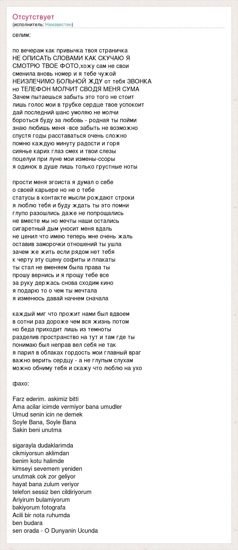 селим: по вечерам как привычка твоя страничка НЕ ОПИСАТЬ СЛОВАМИ КАК СКУЧАЮ Я СМОТРЮ ТВОЕ ФОТО,хожу сам не свои сменила вновь номер и я тебе чужой НЕИЗЛЕЧИМО БОЛЬНОЙ ЖДУ от тебя ЗВОНКА но ТЕЛЕФОН МОЛЧИТ СВОДЯ МЕНЯ СУМА Зачем пытаешься забыть это того не стоит лишь голос мои в трубке сердце твое успокоит дай последний шанс умоляю не молчи бороться буду за любовь - родная ты пойми знаю любишь меня -все забыть не возможно спустя годы расставаться очень сложно помню каждую минуту радости и горя сиянье карих глаз смех и твои слезы поцелуи при луне мои измены-ссоры я одинок в душе лишь только грустные ноты прости меня эгоиста я думал о себе о своей карьере но не о тебе статусы в контакте мысли рождают строки я люблю тебя и буду ждать ты это помни глупо разошлись даже не попрощались не вместе мы но мечты наши остались сигаретный дым уносит меня вдаль не ценил что имею теперь мне очень жаль оставив заморочки отношений ты ушла зачем же жить если рядом нет тебя к черту эту сцену софиты и плакаты ты стал не вменяем была права ты прошу вернись и я прощу тебе все за руку держась снова сходим кино я подарю то о чем ты мечтала я изменюсь давай начнем сначала каждый миг что прожит нами был вдвоем в сотни раз дороже чем вся жизнь потом но беда приходит лишь из темноты разделив пространство на тут и там где ты понимаю был неправ вел себя не так я парил в облаках гордость мои главный враг важно верить сердцу - а не глупым слухам можно обниму тебя и скажу что люблю на ухо фахо: Farz ederim. askimiz bitti Ama acilar icimde vermiyor bana umudler Umud senin icin ne demek Soyle Bana, Soyle Bana Sakin beni unutma sigarayla dudaklarimda cikmiyorsun aklimdan benim kotu halimde kimseyi sevemem yeniden unutmak cok zor geliyor hayat bana zulum veriyor telefon sessiz ben cildiriyorum Ariyirum bulamiyorum bakiyorum fotografa Acili bir nota ruhumda ben budara sen orada - O Dunyanin Ucunda
