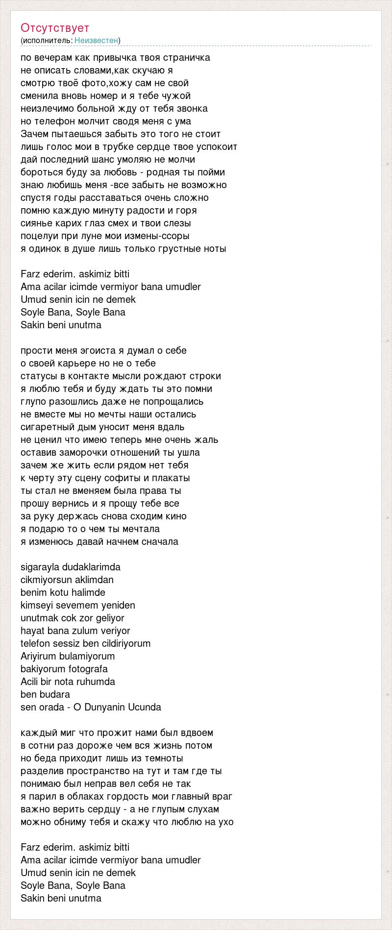 по вечерам как привычка твоя страничка не описать словами,как скучаю я смотрю твоё фото,хожу сам не свой сменила вновь номер и я тебе чужой неизлечимо больной жду от тебя звонка но телефон молчит сводя меня с ума Зачем пытаешься забыть это того не стоит лишь голос мои в трубке сердце твое успокоит дай последний шанс умоляю не молчи бороться буду за любовь - родная ты пойми знаю любишь меня -все забыть не возможно спустя годы расставаться очень сложно помню каждую минуту радости и горя сиянье карих глаз смех и твои слезы поцелуи при луне мои измены-ссоры я одинок в душе лишь только грустные ноты Farz ederim. askimiz bitti Ama acilar icimde vermiyor bana umudler Umud senin icin ne demek Soyle Bana, Soyle Bana Sakin beni unutma прости меня эгоиста я думал о себе о своей карьере но не о тебе статусы в контакте мысли рождают строки я люблю тебя и буду ждать ты это помни глупо разошлись даже не попрощались не вместе мы но мечты наши остались сигаретный дым уносит меня вдаль не ценил что имею теперь мне очень жаль оставив заморочки отношений ты ушла зачем же жить если рядом нет тебя к черту эту сцену софиты и плакаты ты стал не вменяем была права ты прошу вернись и я прощу тебе все за руку держась снова сходим кино я подарю то о чем ты мечтала я изменюсь давай начнем сначала sigarayla dudaklarimda cikmiyorsun aklimdan benim kotu halimde kimseyi sevemem yeniden unutmak cok zor geliyor hayat bana zulum veriyor telefon sessiz ben cildiriyorum Ariyirum bulamiyorum bakiyorum fotografa Acili bir nota ruhumda ben budara sen orada - O Dunyanin Ucunda каждый миг что прожит нами был вдвоем в сотни раз дороже чем вся жизнь потом но беда приходит лишь из темноты разделив пространство на тут и там где ты понимаю был неправ вел себя не так я парил в облаках гордость мои главный враг важно верить сердцу - а не глупым слухам можно обниму тебя и скажу что люблю на ухо Farz ederim. askimiz bitti Ama acilar icimde vermiyor bana umudler Umud senin icin ne demek Soyle Bana, Soyle Bana Sakin beni unutma