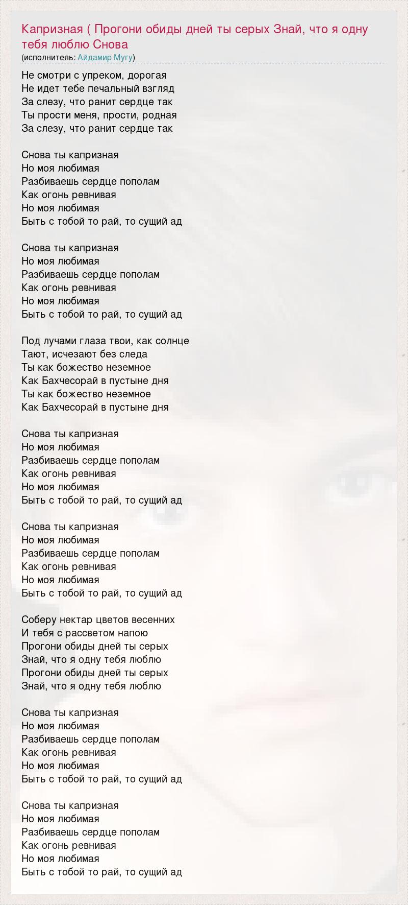Не смотри с упреком, дорогая Не идет тебе печальный взгляд За слезу, что ранит сердце так Ты прости меня, прости, родная За слезу, что ранит сердце так Снова ты капризная Но моя любимая Разбиваешь сердце пополам Как огонь ревнивая Но моя любимая Быть с тобой то рай, то сущий ад Снова ты капризная Но моя любимая Разбиваешь сердце пополам Как огонь ревнивая Но моя любимая Быть с тобой то рай, то сущий ад Под лучами глаза твои, как солнце Тают, исчезают без следа Ты как божество неземное Как Бахчесорай в пустыне дня Ты как божество неземное Как Бахчесорай в пустыне дня Снова ты капризная Но моя любимая Разбиваешь сердце пополам Как огонь ревнивая Но моя любимая Быть с тобой то рай, то сущий ад Снова ты капризная Но моя любимая Разбиваешь сердце пополам Как огонь ревнивая Но моя любимая Быть с тобой то рай, то сущий ад Соберу нектар цветов весенних И тебя с рассветом напою Прогони обиды дней ты серых Знай, что я одну тебя люблю Прогони обиды дней ты серых Знай, что я одну тебя люблю Снова ты капризная Но моя любимая Разбиваешь сердце пополам Как огонь ревнивая Но моя любимая Быть с тобой то рай, то сущий ад Снова ты капризная Но моя любимая Разбиваешь сердце пополам Как огонь ревнивая Но моя любимая Быть с тобой то рай, то сущий ад