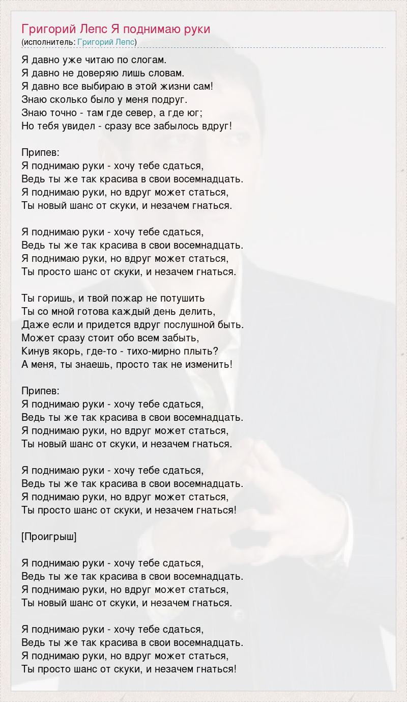 Я давно уже читаю по слогам. Я давно не доверяю лишь словам. Я давно все выбираю в этой жизни сам! Знаю сколько было у меня подруг. Знаю точно - там где север, а где юг; Но тебя увидел - сразу все забылось вдруг! Припев: Я поднимаю руки - хочу тебе сдаться, Ведь ты же так красива в свои восемнадцать. Я поднимаю руки, но вдруг может статься, Ты новый шанс от скуки, и незачем гнаться. Я поднимаю руки - хочу тебе сдаться, Ведь ты же так красива в свои восемнадцать. Я поднимаю руки, но вдруг может статься, Ты просто шанс от скуки, и незачем гнаться. Ты горишь, и твой пожар не потушить Ты со мной готова каждый день делить, Даже если и придется вдруг послушной быть. Может сразу стоит обо всем забыть, Кинув якорь, где-то - тихо-мирно плыть? А меня, ты знаешь, просто так не изменить! Припев: Я поднимаю руки - хочу тебе сдаться, Ведь ты же так красива в свои восемнадцать. Я поднимаю руки, но вдруг может статься, Ты новый шанс от скуки, и незачем гнаться. Я поднимаю руки - хочу тебе сдаться, Ведь ты же так красива в свои восемнадцать. Я поднимаю руки, но вдруг может статься, Ты просто шанс от скуки, и незачем гнаться! [Проигрыш] Я поднимаю руки - хочу тебе сдаться, Ведь ты же так красива в свои восемнадцать. Я поднимаю руки, но вдруг может статься, Ты новый шанс от скуки, и незачем гнаться. Я поднимаю руки - хочу тебе сдаться, Ведь ты же так красива в свои восемнадцать. Я поднимаю руки, но вдруг может статься, Ты просто шанс от скуки, и незачем гнаться!