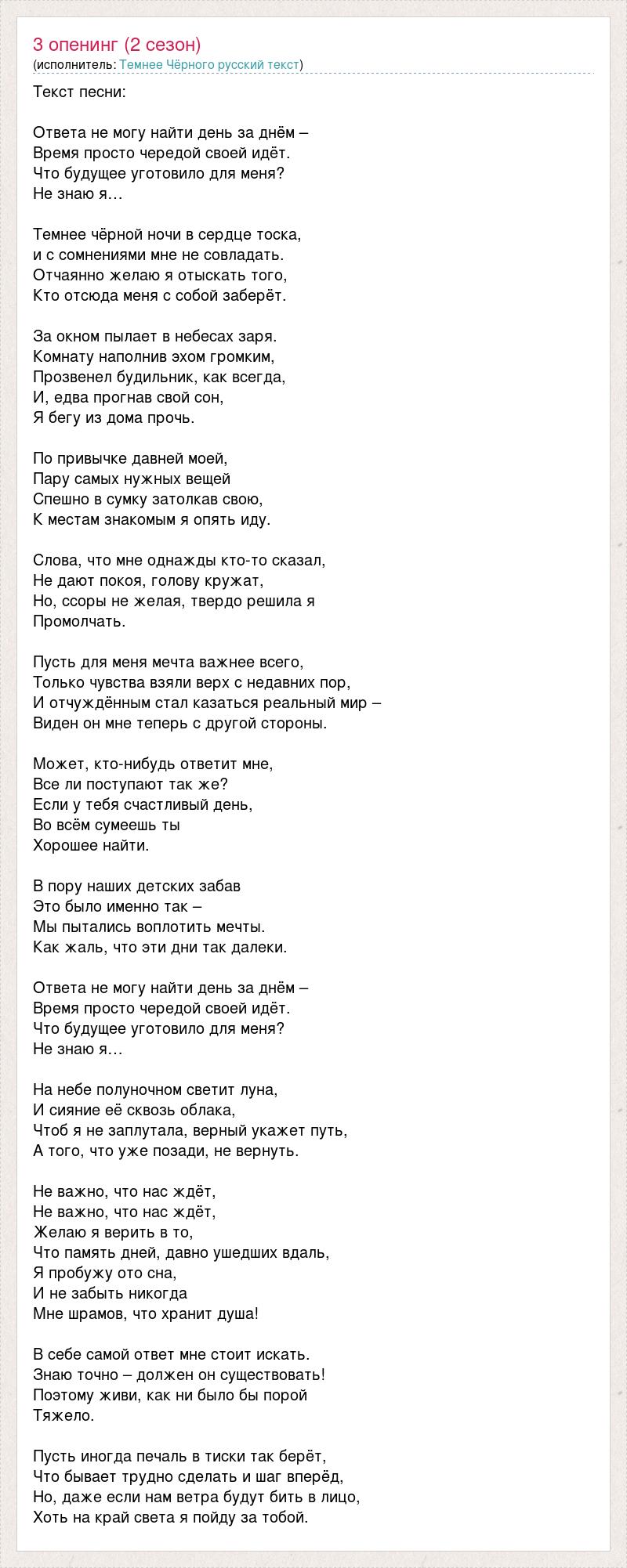 Текст песни: Ответа не могу найти день за днём – Время просто чередой своей идёт. Что будущее уготовило для меня? Не знаю я… Темнее чёрной ночи в сердце тоска, и с сомнениями мне не совладать. Отчаянно желаю я отыскать того, Кто отсюда меня с собой заберёт. За окном пылает в небесах заря. Комнату наполнив эхом громким, Прозвенел будильник, как всегда, И, едва прогнав свой сон, Я бегу из дома прочь. По привычке давней моей, Пару самых нужных вещей Спешно в сумку затолкав свою, К местам знакомым я опять иду. Слова, что мне однажды кто-то сказал, Не дают покоя, голову кружат, Но, ссоры не желая, твердо решила я Промолчать. Пусть для меня мечта важнее всего, Только чувства взяли верх с недавних пор, И отчуждённым стал казаться реальный мир – Виден он мне теперь с другой стороны. Может, кто-нибудь ответит мне, Все ли поступают так же? Если у тебя счастливый день, Во всём сумеешь ты Хорошее найти. В пору наших детских забав Это было именно так – Мы пытались воплотить мечты. Как жаль, что эти дни так далеки. Ответа не могу найти день за днём – Время просто чередой своей идёт. Что будущее уготовило для меня? Не знаю я… На небе полуночном светит луна, И сияние её сквозь облака, Чтоб я не заплутала, верный укажет путь, А того, что уже позади, не вернуть. Не важно, что нас ждёт, Не важно, что нас ждёт, Желаю я верить в то, Что память дней, давно ушедших вдаль, Я пробужу ото сна, И не забыть никогда Мне шрамов, что хранит душа! В себе самой ответ мне стоит искать. Знаю точно – должен он существовать! Поэтому живи, как ни было бы порой Тяжело. Пусть иногда печаль в тиски так берёт, Что бывает трудно сделать и шаг вперёд, Но, даже если нам ветра будут бить в лицо, Хоть на край света я пойду за тобой.