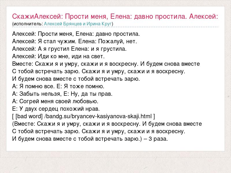 Алексей: Прости меня, Елена: давно простила. Алексей: Я стал чужим. Елена: Пожалуй, нет. Алексей: А я грустил Елена: и я грустила. Алексей: Иди ко мне, иди на свет. Вместе: Скажи я и умру, скажи и я воскресну. И будем снова вместе С тобой встречать зарю. Скажи я и умру, скажи и я воскресну. И будем снова вместе с тобой встречать зарю. А: Я помню все. Е: Я тоже помню. А: Забыть нельзя, Е: Ну, да ты прав. А: Согрей меня своей любовью. Е: У двух сердец похожий нрав. [ [bad word] /bandg.su/bryancev-kasiyanova-skaji.html ] (Вместе: Скажи я и умру, скажи и я воскресну. И будем снова вместе С тобой встречать зарю. Скажи я и умру, скажи и я воскресну. И будем снова вместе с тобой встречать зарю.) – 3 раза.