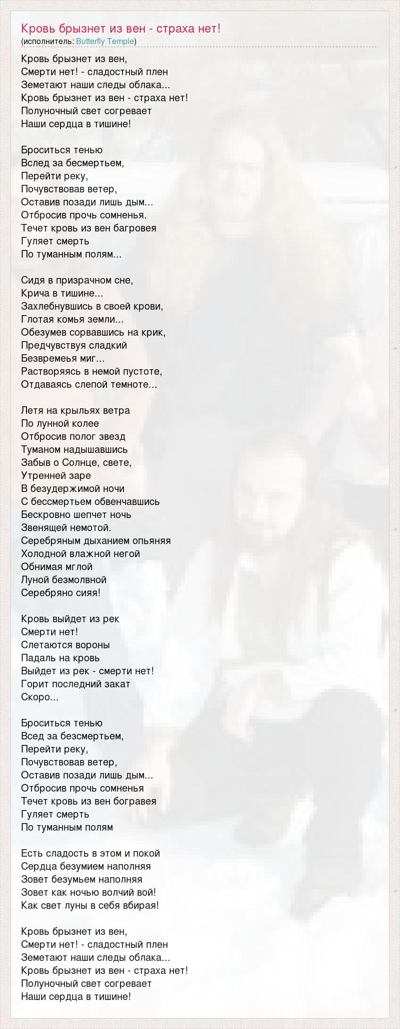 Кровь брызнет из вен, Смерти нет! - сладостный плен Земетают наши следы облака... Кровь брызнет из вен - страха нет! Полуночный свет согревает Наши сердца в тишине! Броситься тенью Вслед за бесмертьем, Перейти реку, Почувствовав ветер, Оставив позади лишь дым... Отбросив прочь сомненья. Течет кровь из вен багровея Гуляет смерть По туманным полям... Сидя в призрачном сне, Крича в тишине... Захлебнувшись в своей крови, Глотая комья земли... Обезумев сорвавшись на крик, Предчувствуя сладкий Безвремеья миг... Растворяясь в немой пустоте, Отдаваясь слепой темноте... Летя на крыльях ветра По лунной колее Отбросив полог звезд Туманом надышавшись Забыв о Солнце, свете, Утренней заре В безудержимой ночи С бессмертьем обвенчавшись Бескровно шепчет ночь Звенящей немотой. Серебряным дыханием опьяняя Холодной влажной негой Обнимая мглой Луной безмолвной Серебряно сияя! Кровь выйдет из рек Смерти нет! Слетаются вороны Падаль на кровь Выйдет из рек - смерти нет! Горит последний закат Скоро... Броситься тенью Всед за безсмертьем, Перейти реку, Почувствовав ветер, Оставив позади лишь дым... Отбросив прочь сомненья Течет кровь из вен богравея Гуляет смерть По туманным полям Есть сладость в этом и покой Сердца безумием наполняя Зовет безумьем наполняя Зовет как ночью волчий вой! Как свет луны в себя вбирая! Кровь брызнет из вен, Смерти нет! - сладостный плен Земетают наши следы облака... Кровь брызнет из вен - страха нет! Полуночный свет согревает Наши сердца в тишине!