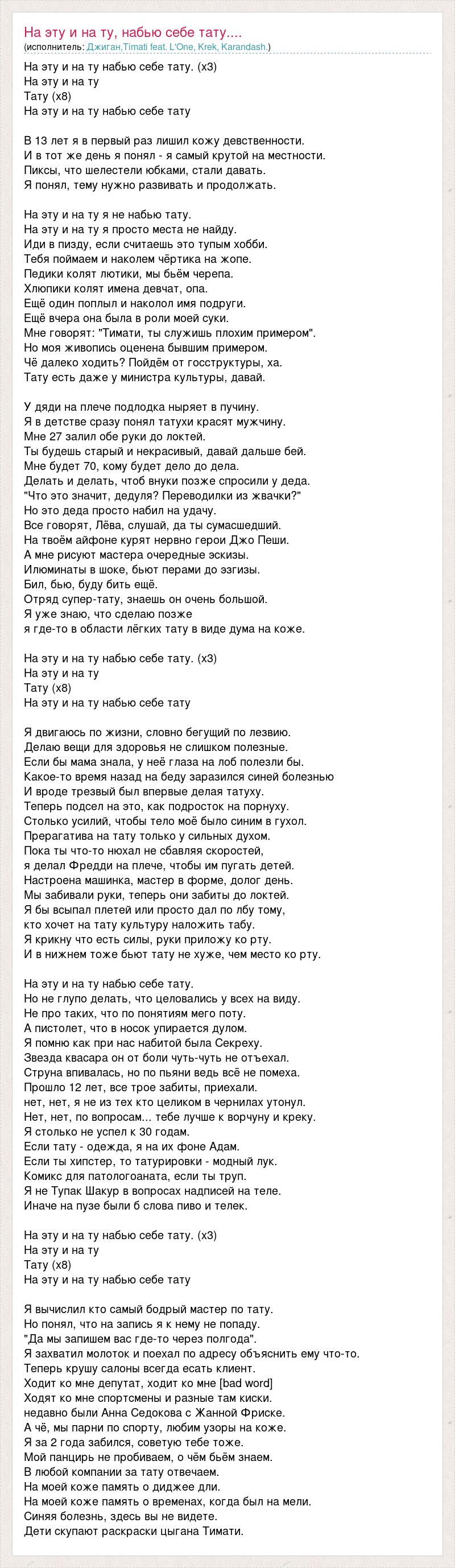 На эту и на ту набью себе тату. (х3) На эту и на ту Тату (х8) На эту и на ту набью себе тату В 13 лет я в первый раз лишил кожу девственности. И в тот же день я понял - я самый крутой на местности. Пиксы, что шелестели юбками, стали давать. Я понял, тему нужно развивать и продолжать. На эту и на ту я не набью тату. На эту и на ту я просто места не найду. Иди в пизду, если считаешь это тупым хобби. Тебя поймаем и наколем чёртика на жопе. Педики колят лютики, мы бьём черепа. Хлюпики колят имена девчат, опа. Ещё один поплыл и наколол имя подруги. Ещё вчера она была в роли моей суки. Мне говорят: "Тимати, ты служишь плохим примером". Но моя живопись оценена бывшим примером. Чё далеко ходить? Пойдём от госструктуры, ха. Тату есть даже у министра культуры, давай. У дяди на плече подлодка ныряет в пучину. Я в детстве сразу понял татухи красят мужчину. Мне 27 залил обе руки до локтей. Ты будешь старый и некрасивый, давай дальше бей. Мне будет 70, кому будет дело до дела. Делать и делать, чтоб внуки позже спросили у деда. "Что это значит, дедуля? Переводилки из жвачки?" Но это деда просто набил на удачу. Все говорят, Лёва, слушай, да ты сумасшедший. На твоём айфоне курят нервно герои Джо Пеши. А мне рисуют мастера очередные эскизы. Илюминаты в шоке, бьют перами до эзгизы. Бил, бью, буду бить ещё. Отряд супер-тату, знаешь он очень большой. Я уже знаю, что сделаю позже я где-то в области лёгких тату в виде дума на коже. На эту и на ту набью себе тату. (х3) На эту и на ту Тату (х8) На эту и на ту набью себе тату Я двигаюсь по жизни, словно бегущий по лезвию. Делаю вещи для здоровья не слишком полезные. Если бы мама знала, у неё глаза на лоб полезли бы. Какое-то время назад на беду заразился синей болезнью И вроде трезвый был впервые делая татуху. Теперь подсел на это, как подросток на порнуху. Столько усилий, чтобы тело моё было синим в гухол. Прерагатива на тату только у сильных духом. Пока ты что-то нюхал не сбавляя скоростей, я делал Фредди на плече, чтобы им пугать детей. Настроена машинка, мастер в форме, долог день. Мы забивали руки, теперь они забиты до локтей. Я бы всыпал плетей или просто дал по лбу тому, кто хочет на тату культуру наложить табу. Я крикну что есть силы, руки приложу ко рту. И в нижнем тоже бьют тату не хуже, чем место ко рту. На эту и на ту набью себе тату. Но не глупо делать, что целовались у всех на виду. Не про таких, что по понятиям мего поту. А пистолет, что в носок упирается дулом. Я помню как при нас набитой была Секреху. Звезда квасара он от боли чуть-чуть не отъехал. Струна впивалась, но по пьяни ведь всё не помеха. Прошло 12 лет, все трое забиты, приехали. нет, нет, я не из тех кто целиком в чернилах утонул. Нет, нет, по вопросам... тебе лучше к ворчуну и креку. Я столько не успел к 30 годам. Если тату - одежда, я на их фоне Адам. Если ты хипстер, то татурировки - модный лук. Комикс для патологоаната, если ты труп. Я не Тупак Шакур в вопросах надписей на теле. Иначе на пузе были б слова пиво и телек. На эту и на ту набью себе тату. (х3) На эту и на ту Тату (х8) На эту и на ту набью себе тату Я вычислил кто самый бодрый мастер по тату. Но понял, что на запись я к нему не попаду. "Да мы запишем вас где-то через полгода". Я захватил молоток и поехал по адресу объяснить ему что-то. Теперь крушу салоны всегда есать клиент. Ходит ко мне депутат, ходит ко мне [bad word] Ходят ко мне спортсмены и разные там киски. недавно были Анн