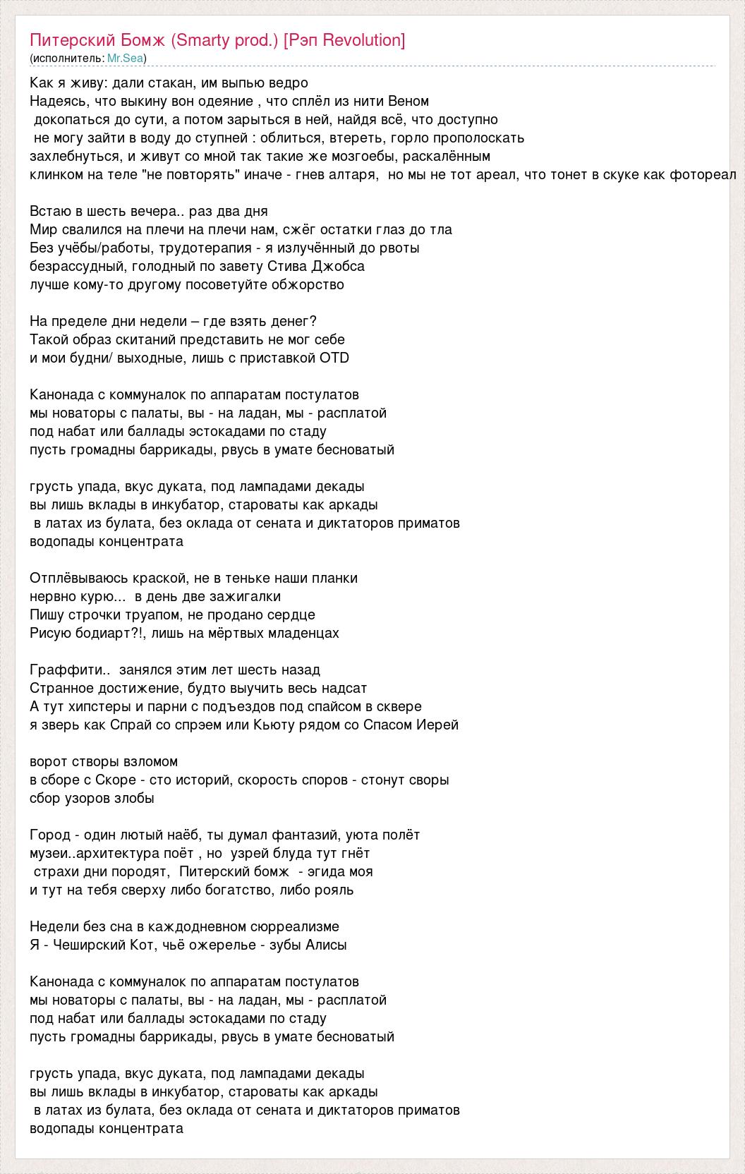 Как я живу: дали стакан, им выпью ведро Надеясь, что выкину вон одеяние , что сплёл из нити Веном докопаться до сути, а потом зарыться в ней, найдя всё, что доступно не могу зайти в воду до ступней : облиться, втереть, горло прополоскать захлебнуться, и живут со мной так такие же мозгоебы, раскалённым клинком на теле "не повторять" иначе - гнев алтаря, но мы не тот ареал, что тонет в скуке как фотореал Встаю в шесть вечера.. раз два дня Мир свалился на плечи на плечи нам, сжёг остатки глаз до тла Без учёбы/работы, трудотерапия - я излучённый до рвоты безрассудный, голодный по завету Стива Джобса лучше кому-то другому посоветуйте обжорство На пределе дни недели – где взять денег? Такой образ скитаний представить не мог себе и мои будни/ выходные, лишь с приставкой OTD Канонада с коммуналок по аппаратам постулатов мы новаторы с палаты, вы - на ладан, мы - расплатой под набат или баллады эстокадами по стаду пусть громадны баррикады, рвусь в умате бесноватый грусть упада, вкус дуката, под лампадами декады вы лишь вклады в инкубатор, староваты как аркады в латах из булата, без оклада от сената и диктаторов приматов водопады концентрата Отплёвываюсь краской, не в теньке наши планки нервно курю... в день две зажигалки Пишу строчки труапом, не продано сердце Рисую бодиарт?!, лишь на мёртвых младенцах Граффити.. занялся этим лет шесть назад Странное достижение, будто выучить весь надсат А тут хипстеры и парни с подъездов под спайсом в сквере я зверь как Спрай со спрэем или Кьюту рядом со Спасом Иерей ворот створы взломом в сборе с Скоре - сто историй, скорость споров - стонут своры сбор узоров злобы Город - один лютый наёб, ты думал фантазий, уюта полёт музеи..архитектура поёт , но узрей блуда тут гнёт страхи дни породят, Питерский бомж - эгида моя и тут на тебя сверху либо богатство, либо рояль Недели без сна в каждодневном сюрреализме Я - Чеширский Кот, чьё ожерелье - зубы Алисы Канонада с коммуналок по аппаратам постулатов мы новаторы с палаты, вы - на ладан, мы - расплатой под набат или баллады эстокадами по стаду пусть громадны баррикады, рвусь в умате бесноватый грусть упада, вкус дуката, под лампадами декады вы лишь вклады в инкубатор, староваты как аркады в латах из булата, без оклада от сената и диктаторов приматов водопады концентрата