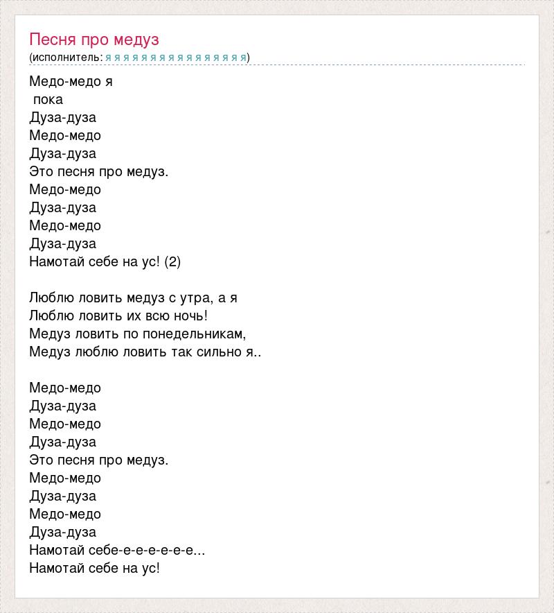 Медо-медо я пока Дуза-дуза Медо-медо Дуза-дуза Это песня про медуз. Медо-медо Дуза-дуза Медо-медо Дуза-дуза Намотай себе на ус! (2) Люблю ловить медуз с утра, а я Люблю ловить их всю ночь! Медуз ловить по понедельникам, Медуз люблю ловить так сильно я.. Медо-медо Дуза-дуза Медо-медо Дуза-дуза Это песня про медуз. Медо-медо Дуза-дуза Медо-медо Дуза-дуза Намотай себе-е-е-е-е-е-е... Намотай себе на ус!