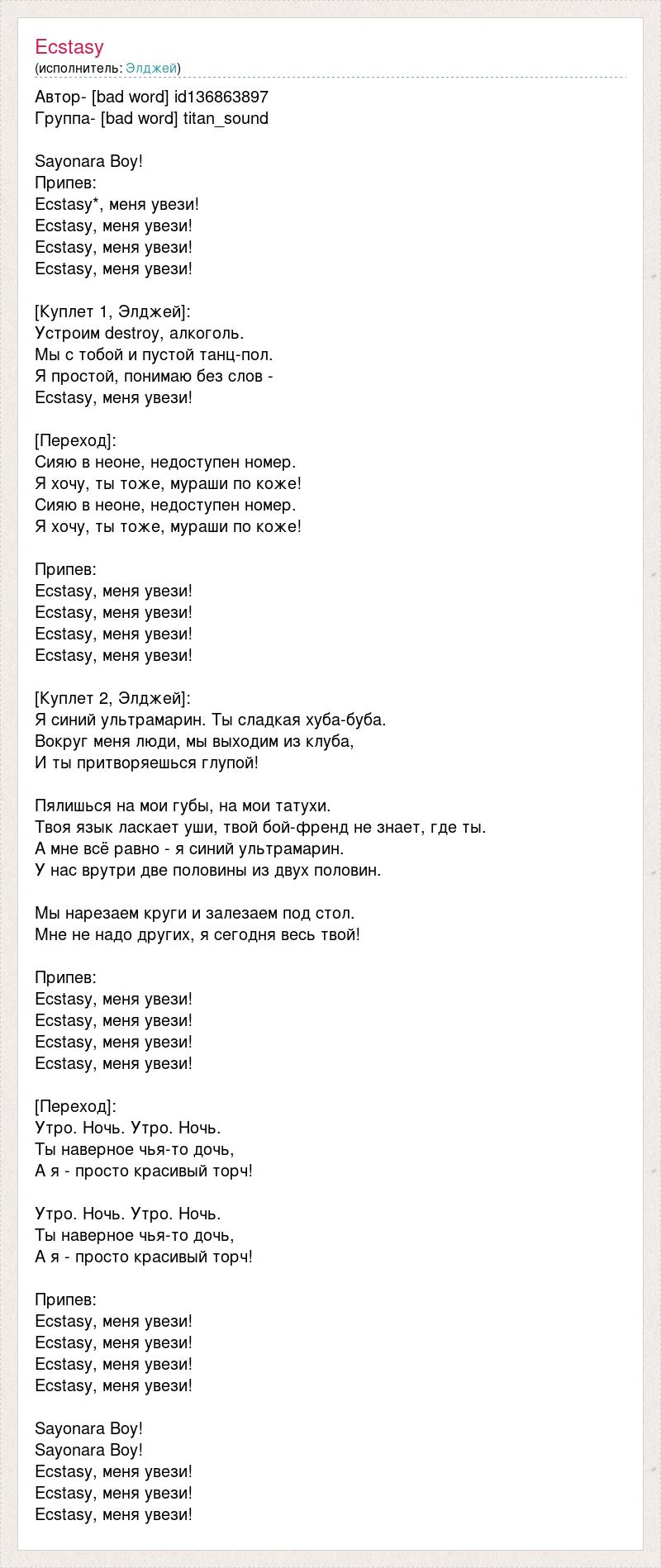 Автор- [bad word] id136863897 Группа- [bad word] titan_sound Sayonara Boy! Припев: Ecstasy*, меня увези! Ecstasy, меня увези! Ecstasy, меня увези! Ecstasy, меня увези! [Куплет 1, Элджей]: Устроим destroy, алкоголь. Мы с тобой и пустой танц-пол. Я простой, понимаю без слов - Ecstasy, меня увези! [Переход]: Сияю в неоне, недоступен номер. Я хочу, ты тоже, мураши по коже! Сияю в неоне, недоступен номер. Я хочу, ты тоже, мураши по коже! Припев: Ecstasy, меня увези! Ecstasy, меня увези! Ecstasy, меня увези! Ecstasy, меня увези! [Куплет 2, Элджей]: Я синий ультрамарин. Ты сладкая хуба-буба. Вокруг меня люди, мы выходим из клуба, И ты притворяешься глупой! Пялишься на мои губы, на мои татухи. Твоя язык ласкает уши, твой бой-френд не знает, где ты. А мне всё равно - я синий ультрамарин. У нас врутри две половины из двух половин. Мы нарезаем круги и залезаем под стол. Мне не надо других, я сегодня весь твой! Припев: Ecstasy, меня увези! Ecstasy, меня увези! Ecstasy, меня увези! Ecstasy, меня увези! [Переход]: Утро. Ночь. Утро. Ночь. Ты наверное чья-то дочь, А я - просто красивый торч! Утро. Ночь. Утро. Ночь. Ты наверное чья-то дочь, А я - просто красивый торч! Припев: Ecstasy, меня увези! Ecstasy, меня увези! Ecstasy, меня увези! Ecstasy, меня увези! Sayonara Boy! Sayonara Boy! Ecstasy, меня увези! Ecstasy, меня увези! Ecstasy, меня увези!