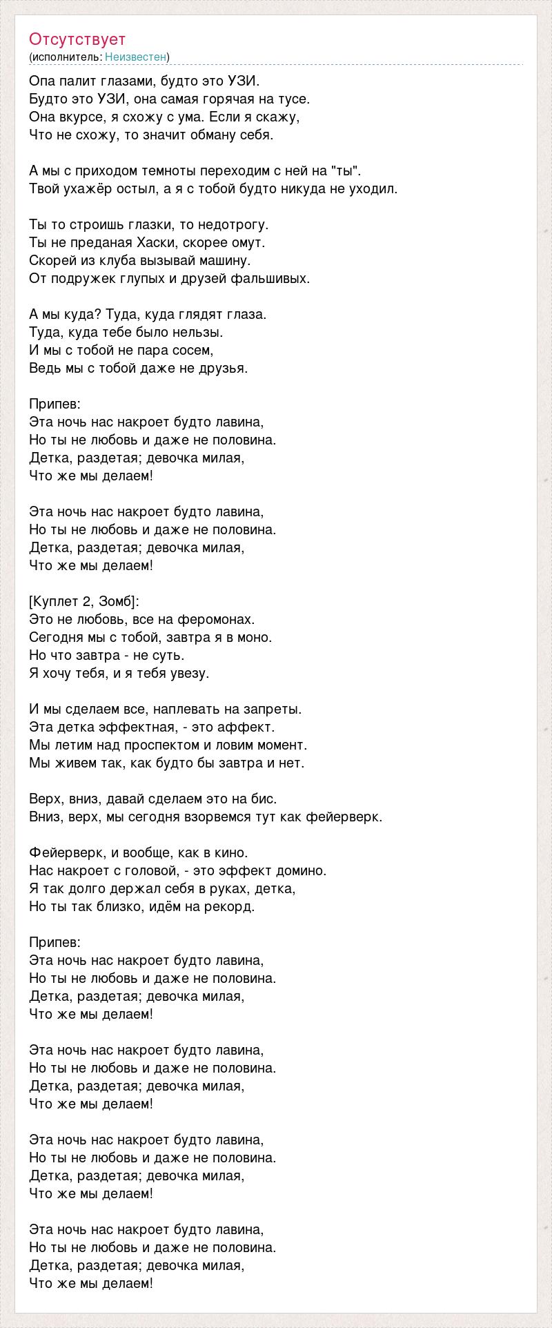 Опа палит глазами, будто это УЗИ. Будто это УЗИ, она самая горячая на тусе. Она вкурсе, я схожу с ума. Если я скажу, Что не схожу, то значит обману себя. А мы с приходом темноты переходим с ней на "ты". Твой ухажёр остыл, а я с тобой будто никуда не уходил. Ты то строишь глазки, то недотрогу. Ты не преданая Хаски, скорее омут. Скорей из клуба вызывай машину. От подружек глупых и друзей фальшивых. А мы куда? Туда, куда глядят глаза. Туда, куда тебе было нельзы. И мы с тобой не пара сосем, Ведь мы с тобой даже не друзья. Припев: Эта ночь нас накроет будто лавина, Но ты не любовь и даже не половина. Детка, раздетая; девочка милая, Что же мы делаем! Эта ночь нас накроет будто лавина, Но ты не любовь и даже не половина. Детка, раздетая; девочка милая, Что же мы делаем! [Куплет 2, Зомб]: Это не любовь, все на феромонах. Сегодня мы с тобой, завтра я в моно. Но что завтра - не суть. Я хочу тебя, и я тебя увезу. И мы сделаем все, наплевать на запреты. Эта детка эффектная, - это аффект. Мы летим над проспектом и ловим момент. Мы живем так, как будто бы завтра и нет. Верх, вниз, давай сделаем это на бис. Вниз, верх, мы сегодня взорвемся тут как фейерверк. Фейерверк, и вообще, как в кино. Нас накроет с головой, - это эффект домино. Я так долго держал себя в руках, детка, Но ты так близко, идём на рекорд. Припев: Эта ночь нас накроет будто лавина, Но ты не любовь и даже не половина. Детка, раздетая; девочка милая, Что же мы делаем! Эта ночь нас накроет будто лавина, Но ты не любовь и даже не половина. Детка, раздетая; девочка милая, Что же мы делаем! Эта ночь нас накроет будто лавина, Но ты не любовь и даже не половина. Детка, раздетая; девочка милая, Что же мы делаем! Эта ночь нас накроет будто лавина, Но ты не любовь и даже не половина. Детка, раздетая; девочка милая, Что же мы делаем!