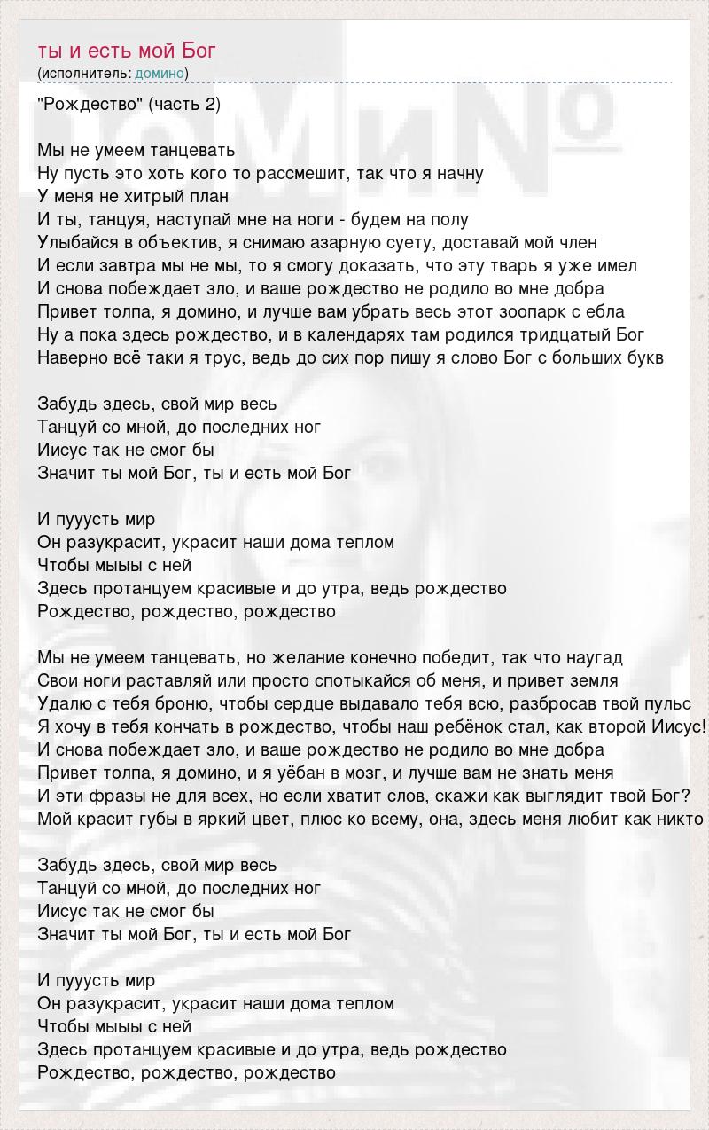 "Рождество" (часть 2) Мы не умеем танцевать Ну пусть это хоть кого то рассмешит, так что я начну У меня не хитрый план И ты, танцуя, наступай мне на ноги - будем на полу Улыбайся в объектив, я снимаю азарную суету, доставай мой член И если завтра мы не мы, то я смогу доказать, что эту тварь я уже имел И снова побеждает зло, и ваше рождество не родило во мне добра Привет толпа, я домино, и лучше вам убрать весь этот зоопарк с ебла Ну а пока здесь рождество, и в календарях там родился тридцатый Бог Наверно всё таки я трус, ведь до сих пор пишу я слово Бог с больших букв Забудь здесь, свой мир весь Танцуй со мной, до последних ног Иисус так не смог бы Значит ты мой Бог, ты и есть мой Бог И пууусть мир Он разукрасит, украсит наши дома теплом Чтобы мыыы с ней Здесь протанцуем красивые и до утра, ведь рождество Рождество, рождество, рождество Мы не умеем танцевать, но желание конечно победит, так что наугад Свои ноги раставляй или просто спотыкайся об меня, и привет земля Удалю с тебя броню, чтобы сердце выдавало тебя всю, разбросав твой пульс Я хочу в тебя кончать в рождество, чтобы наш ребёнок стал, как второй Иисус! И снова побеждает зло, и ваше рождество не родило во мне добра Привет толпа, я домино, и я уёбан в мозг, и лучше вам не знать меня И эти фразы не для всех, но если хватит слов, скажи как выглядит твой Бог? Мой красит губы в яркий цвет, плюс ко всему, она, здесь меня любит как никто Забудь здесь, свой мир весь Танцуй со мной, до последних ног Иисус так не смог бы Значит ты мой Бог, ты и есть мой Бог И пууусть мир Он разукрасит, украсит наши дома теплом Чтобы мыыы с ней Здесь протанцуем красивые и до утра, ведь рождество Рождество, рождество, рождество