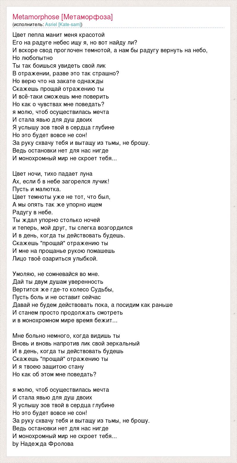 Цвет пепла манит меня красотой Его на радуге небес ищу я, но вот найду ли? И вскоре свод проглочен темнотой, а нам бы радугу вернуть на небо, Но любопытно Ты так боишься увидеть свой лик В отражении, разве это так страшно? Но верю что на закате однажды Скажешь прощай отражению ты И всё-таки сможешь мне поверить Но как о чувствах мне поведать? я молю, чтоб осуществилась мечта И стала явью для душ двоих Я услышу зов твой в сердца глубине Но это будет вовсе не сон! За руку схвачу тебя и вытащу из тьмы, не брошу. Ведь остановки нет для нас нигде И монохромный мир не скроет тебя... Цвет ночи, тихо падает луна Ах, если б в небе загорелся лучик! Пусть и малютка. Цвет темноты уже не тот, что был, А мы опять так же упорно ищем Радугу в небе. Ты ждал упорно столько ночей и теперь, мой друг, ты слегка возгордился И в день, когда ты действовать будешь. Скажешь "прощай" отражению ты И мне на прощанье рукою помашешь Лицо твоё озариться улыбкой. Умоляю, не сомневайся во мне. Дай ты двум душам уверенность Вертится же где-то колесо Судьбы, Пусть боль и не оставит сейчас Давай не будем действовать пока, а посидим как раньше И станем просто продолжать смотреть и в монохромном мире время бежит... Мне больно немного, когда видишь ты Вновь и вновь напротив лик свой зеркальный И в день, когда ты действовать будешь Скажешь "прощай" отражению ты И я твоею защитою стану Но как об этом мне поведать? я молю, чтоб осуществилась мечта И стала явью для душ двоих Я услышу зов твой в сердца глубине Но это будет вовсе не сон! За руку схвачу тебя и вытащу из тьмы, не брошу. Ведь остановки нет для нас нигде И монохромный мир не скроет тебя... by Надежда Фролова