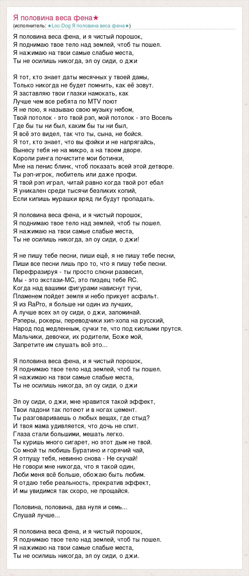 Я половина веса фена, и я чистый порошок, Я поднимаю твое тело над землей, чтоб ты пошел. Я нажимаю на твои самые слабые места, Ты не осилишь никогда, эл оу сиди, о джи Я тот, кто знает даты месячных у твоей дамы, Только никогда не будет помнить, как её зовут. Я заставляю твои глазки намокать, как Лучше чем все ребята по MTV поют Я не пою, я называю свою музыку небом, Твой потолок - это твой рэп, мой потолок - это Восель Где бы ты ни был, каким бы ты ни был, Я всё это видел, так что ты, сына, не бойся. Я тот, кто знает, что вы фэйки и не напрягайсь, Вынесу тебя не на микро, а на твоем дворе. Короли ринга почистите мои ботинки, Мне на пенис блинк, чтоб показать всей этой детворе. Ты рэп-игрок, любитель или даже профи. Я твой рэп играл, читай равно когда твой рот ебал Я уникален среди тысячи безликих копий, Если кипишь мурашки вряд ли будут пропадать. Я половина веса фена, и я чистый порошок, Я поднимаю твое тело над землей, чтоб ты пошел. Я нажимаю на твои самые слабые места, Ты не осилишь никогда, эл оу сиди, о джи! Я не пишу тебе песни, пиши ещё, я не пишу тебе песни, Пиши все песни лишь про то, что я пишу тебе песни. Перефразируя - ты просто слюни развесил, Мы - это экстази-МС, это пиздец тебе RС. Когда над вашими фигурами нависнут тучи, Пламенем пойдет земля и небо прикует асфальт. Я из RaPro, я больше ни один из лучших, А лучше всех эл оу сиди, о джи, запоминай. Рэперы, рокеры, переводчики хип-хопа на русский, Народ под медленным, сучки те, что под кислыми прутся. Мальчики, девочки, их родители, Боже мой, Запретите им слушать всё это... Я половина веса фена, и я чистый порошок, Я поднимаю твое тело над землей, чтоб ты пошел. Я нажимаю на твои самые слабые места, Ты не осилишь никогда, эл оу сиди, о джи Эл оу сиди, о джи, мне нравится такой эффект, Твои ладони так потеют и в ногах цемент. Ты разговариваешь о любых вещах, где стыд? И твоя мама удивляется, что дочь не спит. Глаза стали большими, мешать легко. Ты куришь много сигарет, но этот дым не твой. Со мной ты любишь Буратино и горячий чай, Я отпущу тебя, невинно снова - Не скучай! Не говори мне никогда, что я такой один, Люби меня всё больше, обожаю быть любим. Я отдаю тебе реальность, прекратив эффект, И мы увидимся так скоро, не прощайся. Половина, половина, два нуля и семь... Слушай лучше... Я половина веса фена, и я чистый порошок, Я поднимаю твое тело над землей, чтоб ты пошел. Я нажимаю на твои самые слабые места, Ты не осилишь никогда, эл оу сиди, о джи.