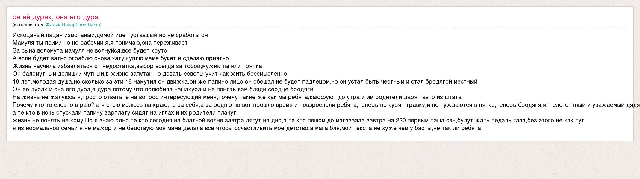 Искоцаный,пацан измотаный,домой идет уставшый,но не сработы он Мамуля ты пойми но не рабочий я,я понимаю,она переживает За сына воломута мамуля не волнуйся,все будет круто А если будет ватно ограблю снова хату куплю маме букет,и сделаю приятно Жизнь научила избавляться от недостатка,выбор всегда за тобой,мужик ты или тряпка Он баломутный делишки мутный,в жизне запутан но довать советы учит как жить бессмысленно 18 лет,молодая душа,но сколько за эти 18 намутил он движка,он же папино лицо он обещал не будет падлецом,но он устал быть честным и стал бродягой местный Он ее дурак и она его дура,а дура потому что полюбила нашакура,и не понять вам бляди,сердце бродяги На жизнь не жалуюсь я,просто ответьте на вопрос интересующий меня,почему такие же как мы ребята,каюфуют до утра и им родители дарят авто из штата Почему кто то словно в раю? а я стою молюсь на краю,не за себя,а за родню но вот прошло время и повзрослели ребята,теперь не курят травку,и не нуждаются в пятке,теперь бродягя,интелегентный и уважаемый дядя а те кто в ночь спускали папину зарплату,сидят на иглах и их родители плачут жизнь не понять не кому,Но я знаю одно,те кто сегодня на блатной волне завтра лягут на дно,а те кто пешом до магазаааа,завтра на 220 первым паша сэн,будут жать педаль газа,без этого не как тут я из нормальной семьи я не мажор и не бедствую моя мама делала все чтобы осчастливить мое детство,а мага бля,мои текста не хуже чем у басты,не так ли ребята