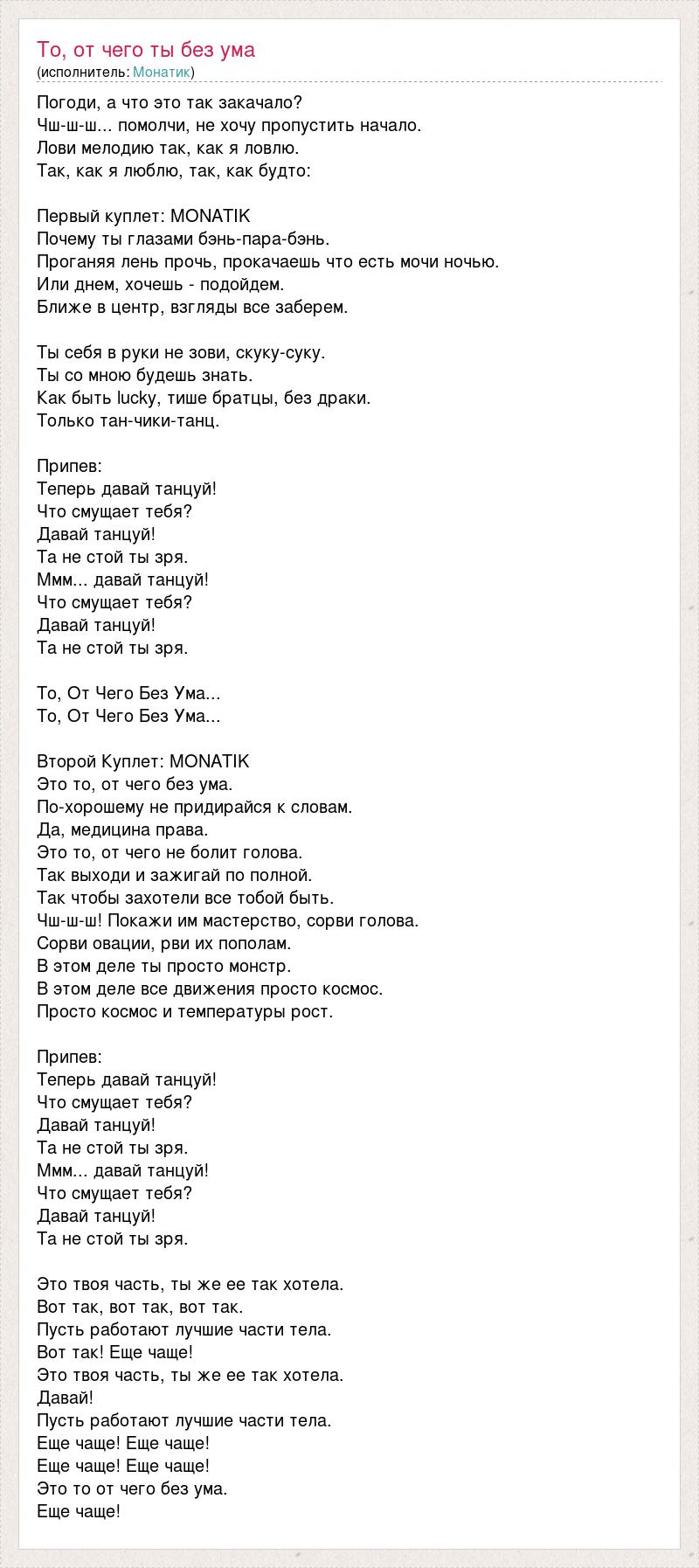 Погоди, а что это так закачало? Чш-ш-ш... помолчи, не хочу пропустить начало. Лови мелодию так, как я ловлю. Так, как я люблю, так, как будто: Первый куплет: MONATIK Почему ты глазами бэнь-пара-бэнь. Проганяя лень прочь, прокачаешь что есть мочи ночью. Или днем, хочешь - подойдем. Ближе в центр, взгляды все заберем. Ты себя в руки не зови, скуку-суку. Ты со мною будешь знать. Как быть lucky, тише братцы, без драки. Только тан-чики-танц. Припев: Теперь давай танцуй! Что смущает тебя? Давай танцуй! Та не стой ты зря. Ммм... давай танцуй! Что смущает тебя? Давай танцуй! Та не стой ты зря. То, От Чего Без Ума... То, От Чего Без Ума... Второй Куплет: MONATIK Это то, от чего без ума. По-хорошему не придирайся к словам. Да, медицина права. Это то, от чего не болит голова. Так выходи и зажигай по полной. Так чтобы захотели все тобой быть. Чш-ш-ш! Покажи им мастерство, сорви голова. Сорви овации, рви их пополам. В этом деле ты просто монстр. В этом деле все движения просто космос. Просто космос и температуры рост. Припев: Теперь давай танцуй! Что смущает тебя? Давай танцуй! Та не стой ты зря. Ммм... давай танцуй! Что смущает тебя? Давай танцуй! Та не стой ты зря. Это твоя часть, ты же ее так хотела. Вот так, вот так, вот так. Пусть работают лучшие части тела. Вот так! Еще чаще! Это твоя часть, ты же ее так хотела. Давай! Пусть работают лучшие части тела. Еще чаще! Еще чаще! Еще чаще! Еще чаще! Это то от чего без ума. Еще чаще!