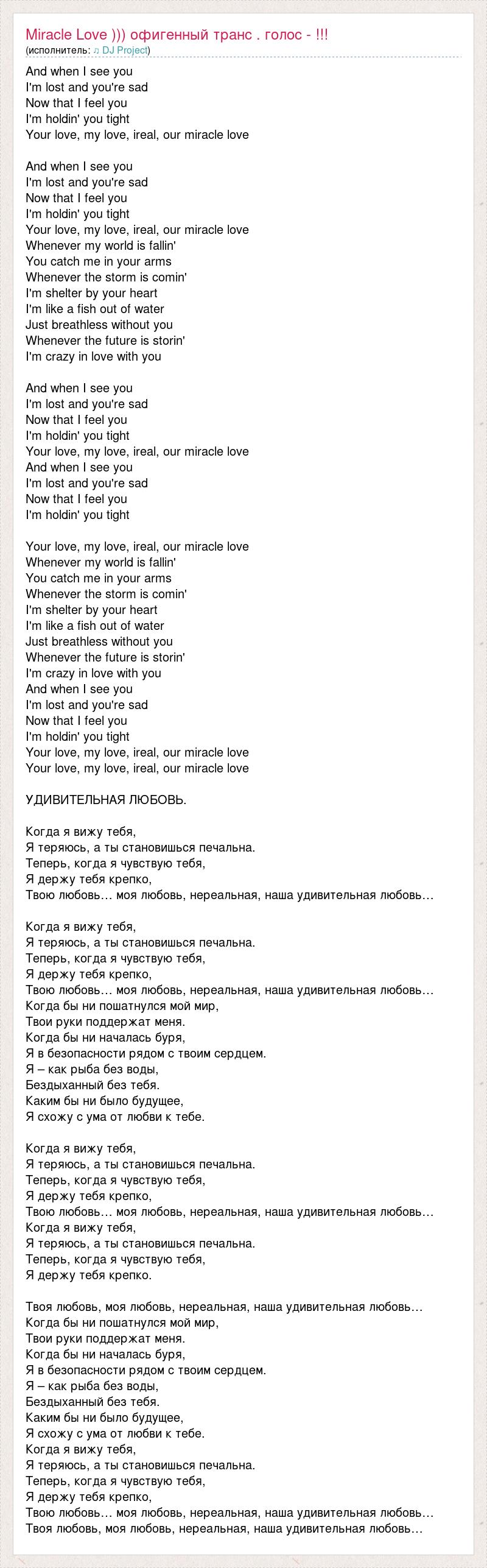 And when I see you I'm lost and you're sad Now that I feel you I'm holdin' you tight Your love, my love, ireal, our miracle love And when I see you I'm lost and you're sad Now that I feel you I'm holdin' you tight Your love, my love, ireal, our miracle love Whenever my world is fallin' You catch me in your arms Whenever the storm is comin' I'm shelter by your heart I'm like a fish out of water Just breathless without you Whenever the future is storin' I'm crazy in love with you And when I see you I'm lost and you're sad Now that I feel you I'm holdin' you tight Your love, my love, ireal, our miracle love And when I see you I'm lost and you're sad Now that I feel you I'm holdin' you tight Your love, my love, ireal, our miracle love Whenever my world is fallin' You catch me in your arms Whenever the storm is comin' I'm shelter by your heart I'm like a fish out of water Just breathless without you Whenever the future is storin' I'm crazy in love with you And when I see you I'm lost and you're sad Now that I feel you I'm holdin' you tight Your love, my love, ireal, our miracle love Your love, my love, ireal, our miracle love УДИВИТЕЛЬНАЯ ЛЮБОВЬ. Когда я вижу тебя, Я теряюсь, а ты становишься печальна. Теперь, когда я чувствую тебя, Я держу тебя крепко, Твою любовь… моя любовь, нереальная, наша удивительная любовь… Когда я вижу тебя, Я теряюсь, а ты становишься печальна. Теперь, когда я чувствую тебя, Я держу тебя крепко, Твою любовь… моя любовь, нереальная, наша удивительная любовь… Когда бы ни пошатнулся мой мир, Твои руки поддержат меня. Когда бы ни началась буря, Я в безопасности рядом с твоим сердцем. Я – как рыба без воды, Бездыханный без тебя. Каким бы ни было будущее, Я схожу с ума от любви к тебе. Когда я вижу тебя, Я теряюсь, а ты становишься печальна. Теперь, когда я чувствую тебя, Я держу тебя крепко, Твою любовь… моя любовь, нереальная, наша удивительная любовь… Когда я вижу тебя, Я теряюсь, а ты становишься печальна. Теперь, когда я чувствую тебя, Я держу тебя крепко. Твоя любовь, моя любовь, нереальная, наша удивительная любовь… Когда бы ни пошатнулся мой мир, Твои руки поддержат меня. Когда бы ни началась буря, Я в безопасности рядом с твоим сердцем. Я – как рыба без воды, Бездыханный без тебя. Каким бы ни было будущее, Я схожу с ума от любви к тебе. Когда я вижу тебя, Я теряюсь, а ты становишься печальна. Теперь, когда я чувствую тебя, Я держу тебя крепко, Твою любовь… моя любовь, нереальная, наша удивительная любовь… Твоя любовь, моя любовь, нереальная, наша удивительная любовь…