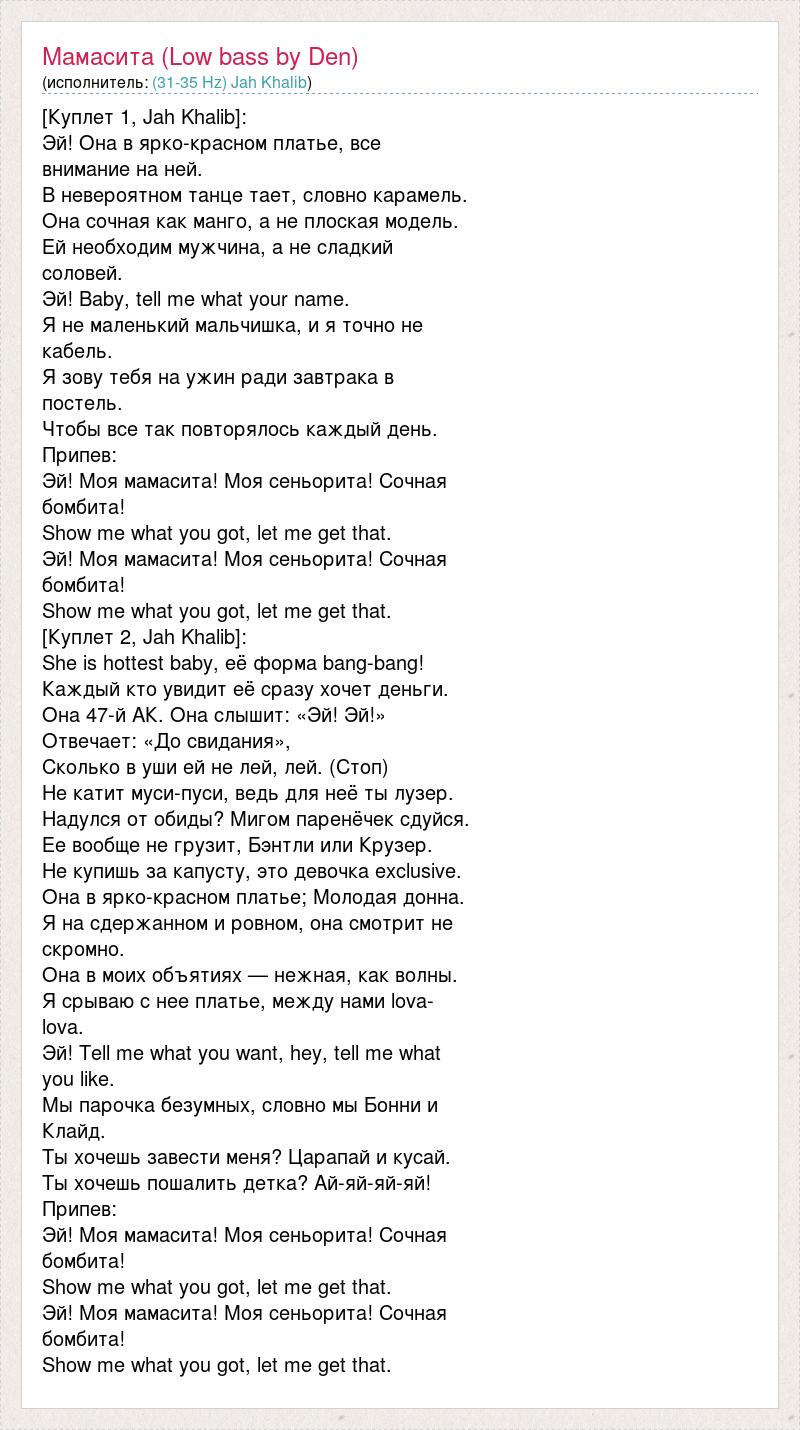 [Куплет 1, Jah Khalib]: Эй! Она в ярко-красном платье, все внимание на ней. В невероятном танце тает, словно карамель. Она сочная как манго, а не плоская модель. Ей необходим мужчина, а не сладкий соловей. Эй! Baby, tell me what your name. Я не маленький мальчишка, и я точно не кабель. Я зову тебя на ужин ради завтрака в постель. Чтобы все так повторялось каждый день. Припев: Эй! Моя мамасита! Моя сеньорита! Сочная бомбита! Show me what you got, let me get that. Эй! Моя мамасита! Моя сеньорита! Сочная бомбита! Show me what you got, let me get that. [Куплет 2, Jah Khalib]: She is hottest baby, её форма bang-bang! Каждый кто увидит её сразу хочет деньги. Она 47-й АК. Она слышит: «Эй! Эй!» Отвечает: «До свидания», Сколько в уши ей не лей, лей. (Стоп) Не катит муси-пуси, ведь для неё ты лузер. Надулся от обиды? Мигом паренёчек сдуйся. Ее вообще не грузит, Бэнтли или Крузер. Не купишь за капусту, это девочка exclusive. Она в ярко-красном платье; Молодая донна. Я на сдержанном и ровном, она смотрит не скромно. Она в моих объятиях — нежная, как волны. Я срываю с нее платье, между нами lova- lova. Эй! Tell me what you want, hey, tell me what you like. Мы парочка безумных, словно мы Бонни и Клайд. Ты хочешь завести меня? Царапай и кусай. Ты хочешь пошалить детка? Ай-яй-яй-яй! Припев: Эй! Моя мамасита! Моя сеньорита! Сочная бомбита! Show me what you got, let me get that. Эй! Моя мамасита! Моя сеньорита! Сочная бомбита! Show me what you got, let me get that.