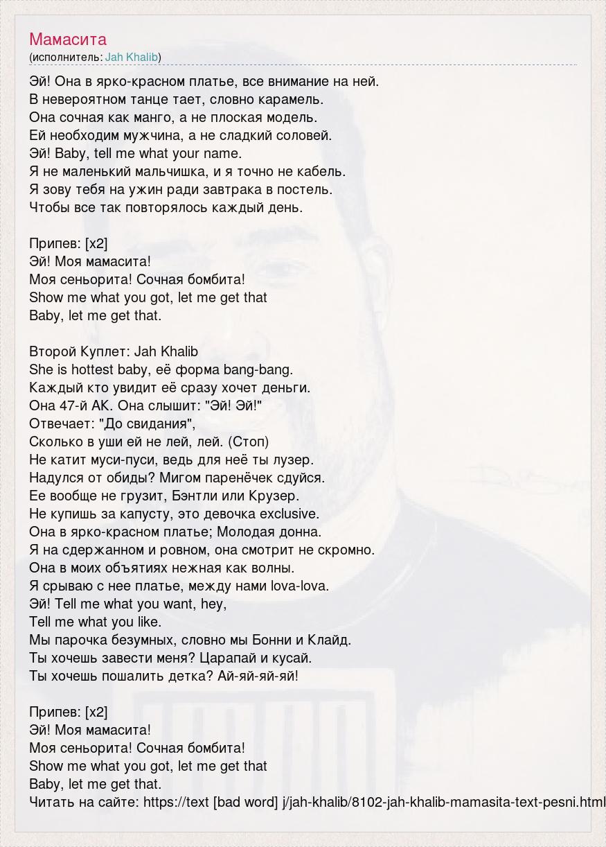 Эй! Она в ярко-красном платье, все внимание на ней. В невероятном танце тает, словно карамель. Она сочная как манго, а не плоская модель. Ей необходим мужчина, а не сладкий соловей. Эй! Baby, tell me what your name. Я не маленький мальчишка, и я точно не кабель. Я зову тебя на ужин ради завтрака в постель. Чтобы все так повторялось каждый день. Припев: [x2] Эй! Моя мамасита! Моя сеньорита! Сочная бомбита! Show me what you got, let me get that Baby, let me get that. Второй Куплет: Jah Khalib She is hottest baby, её форма bang-bang. Каждый кто увидит её сразу хочет деньги. Она 47-й АК. Она слышит: "Эй! Эй!" Отвечает: "До свидания", Сколько в уши ей не лей, лей. (Стоп) Не катит муси-пуси, ведь для неё ты лузер. Надулся от обиды? Мигом паренёчек сдуйся. Ее вообще не грузит, Бэнтли или Крузер. Не купишь за капусту, это девочка exclusive. Она в ярко-красном платье; Молодая донна. Я на сдержанном и ровном, она смотрит не скромно. Она в моих объятиях нежная как волны. Я срываю с нее платье, между нами lova-lova. Эй! Tell me what you want, hey, Tell me what you like. Мы парочка безумных, словно мы Бонни и Клайд. Ты хочешь завести меня? Царапай и кусай. Ты хочешь пошалить детка? Ай-яй-яй-яй! Припев: [x2] Эй! Моя мамасита! Моя сеньорита! Сочная бомбита! Show me what you got, let me get that Baby, let me get that. Читать на сайте: https://text [bad word] j/jah-khalib/8102-jah-khalib-mamasita-text-pesni.html