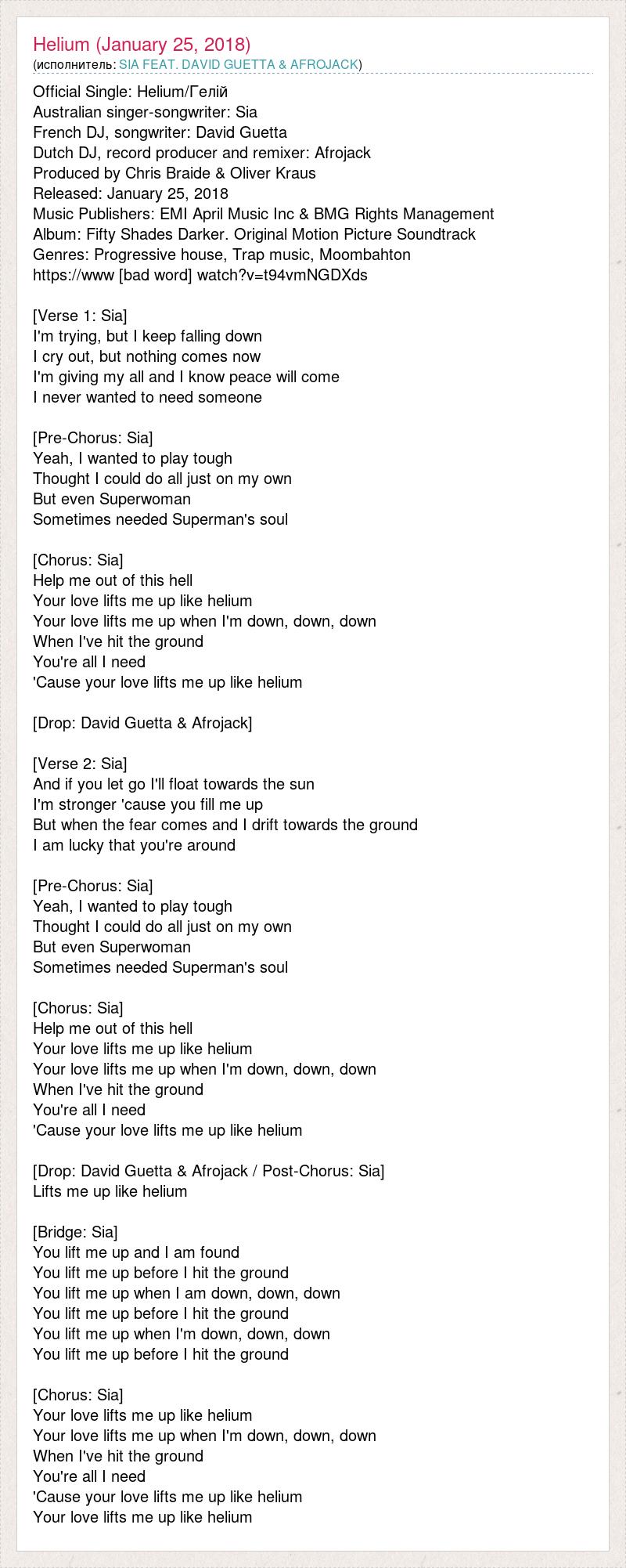 Official Single: Helium/Гелій Australian singer-songwriter: Sia French DJ, songwriter: David Guetta Dutch DJ, record producer and remixer: Afrojack Produced by Chris Braide & Oliver Kraus Released: January 25, 2018 Music Publishers: EMI April Music Inc & BMG Rights Management Album: Fifty Shades Darker. Original Motion Picture Soundtrack Genres: Progressive house, Trap music, Moombahton https://www [bad word] watch?v=t94vmNGDXds [Verse 1: Sia] I'm trying, but I keep falling down I cry out, but nothing comes now I'm giving my all and I know peace will come I never wanted to need someone [Pre-Chorus: Sia] Yeah, I wanted to play tough Thought I could do all just on my own But even Superwoman Sometimes needed Superman's soul [Chorus: Sia] Help me out of this hell Your love lifts me up like helium Your love lifts me up when I'm down, down, down When I've hit the ground You're all I need 'Cause your love lifts me up like helium [Drop: David Guetta & Afrojack] [Verse 2: Sia] And if you let go I'll float towards the sun I'm stronger 'cause you fill me up But when the fear comes and I drift towards the ground I am lucky that you're around [Pre-Chorus: Sia] Yeah, I wanted to play tough Thought I could do all just on my own But even Superwoman Sometimes needed Superman's soul [Chorus: Sia] Help me out of this hell Your love lifts me up like helium Your love lifts me up when I'm down, down, down When I've hit the ground You're all I need 'Cause your love lifts me up like helium [Drop: David Guetta & Afrojack / Post-Chorus: Sia] Lifts me up like helium [Bridge: Sia] You lift me up and I am found You lift me up before I hit the ground You lift me up when I am down, down, down You lift me up before I hit the ground You lift me up when I'm down, down, down You lift me up before I hit the ground [Chorus: Sia] Your love lifts me up like helium Your love lifts me up when I'm down, down, down When I've hit the ground You're all I need 'Cause your love lifts me up like helium Your love lifts me up like helium