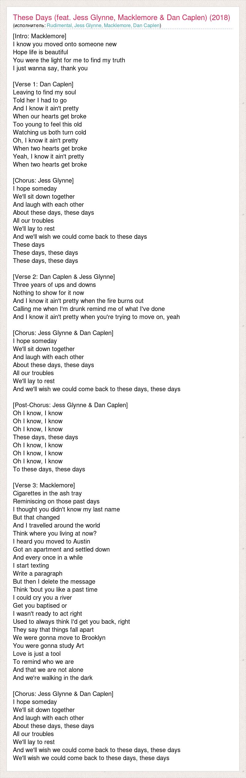 [Intro: Macklemore] I know you moved onto someone new Hope life is beautiful You were the light for me to find my truth I just wanna say, thank you [Verse 1: Dan Caplen] Leaving to find my soul Told her I had to go And I know it ain't pretty When our hearts get broke Too young to feel this old Watching us both turn cold Oh, I know it ain't pretty When two hearts get broke Yeah, I know it ain't pretty When two hearts get broke [Chorus: Jess Glynne] I hope someday We'll sit down together And laugh with each other About these days, these days All our troubles We'll lay to rest And we'll wish we could come back to these days These days These days, these days These days, these days [Verse 2: Dan Caplen & Jess Glynne] Three years of ups and downs Nothing to show for it now And I know it ain't pretty when the fire burns out Calling me when I'm drunk remind me of what I've done And I know it ain't pretty when you're trying to move on, yeah [Chorus: Jess Glynne & Dan Caplen] I hope someday We'll sit down together And laugh with each other About these days, these days All our troubles We'll lay to rest And we'll wish we could come back to these days, these days [Post-Chorus: Jess Glynne & Dan Caplen] Oh I know, I know Oh I know, I know Oh I know, I know These days, these days Oh I know, I know Oh I know, I know Oh I know, I know To these days, these days [Verse 3: Macklemore] Cigarettes in the ash tray Reminiscing on those past days I thought you didn't know my last name But that changed And I travelled around the world Think where you living at now? I heard you moved to Austin Got an apartment and settled down And every once in a while I start texting Write a paragraph But then I delete the message Think 'bout you like a past time I could cry you a river Get you baptised or I wasn't ready to act right Used to always think I'd get you back, right They say that things fall apart We were gonna move to Brooklyn You were gonna study Art Love is just a tool To remind who we are And that we are not alone And we're walking in the dark [Chorus: Jess Glynne & Dan Caplen] I hope someday We'll sit down together And laugh with each other About these days, these days All our troubles We'll lay to rest And we'll wish we could come back to these days, these days We'll wish we could come back to these days, these days