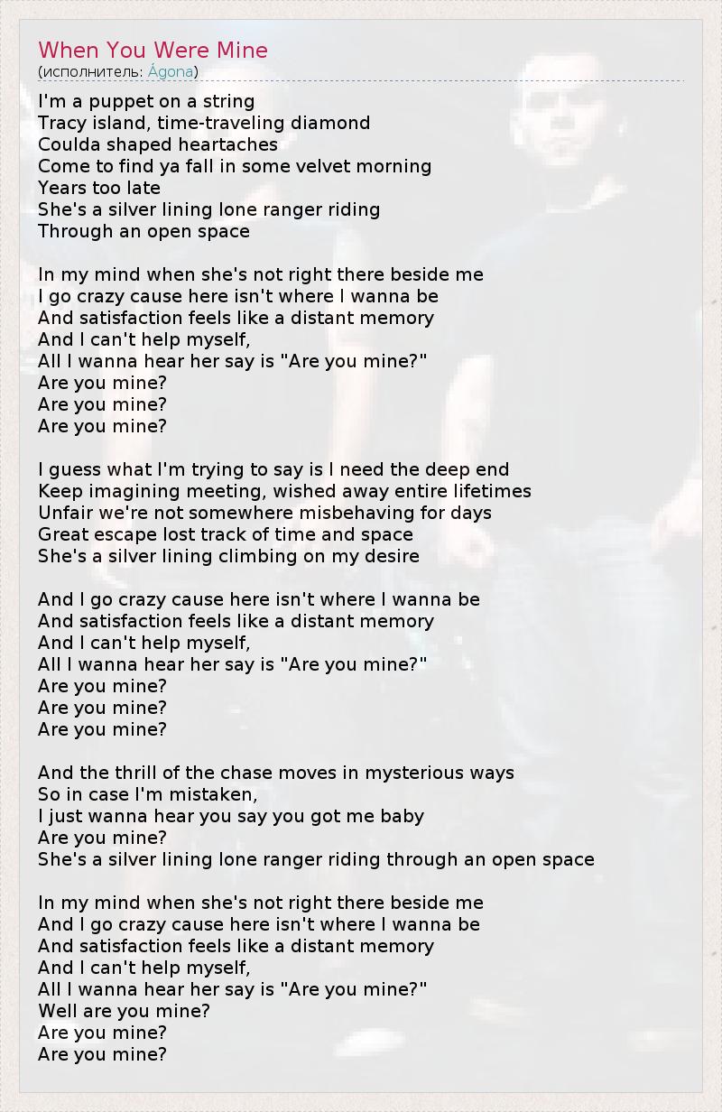 I'm a puppet on a string Tracy island, time-traveling diamond Coulda shaped heartaches Come to find ya fall in some velvet morning Years too late She's a silver lining lone ranger riding Through an open space In my mind when she's not right there beside me I go crazy cause here isn't where I wanna be And satisfaction feels like a distant memory And I can't help myself, All I wanna hear her say is "Are you mine?" Are you mine? Are you mine? Are you mine? I guess what I'm trying to say is I need the deep end Keep imagining meeting, wished away entire lifetimes Unfair we're not somewhere misbehaving for days Great escape lost track of time and space She's a silver lining climbing on my desire And I go crazy cause here isn't where I wanna be And satisfaction feels like a distant memory And I can't help myself, All I wanna hear her say is "Are you mine?" Are you mine? Are you mine? Are you mine? And the thrill of the chase moves in mysterious ways So in case I'm mistaken, I just wanna hear you say you got me baby Are you mine? She's a silver lining lone ranger riding through an open space In my mind when she's not right there beside me And I go crazy cause here isn't where I wanna be And satisfaction feels like a distant memory And I can't help myself, All I wanna hear her say is "Are you mine?" Well are you mine? Are you mine? Are you mine?