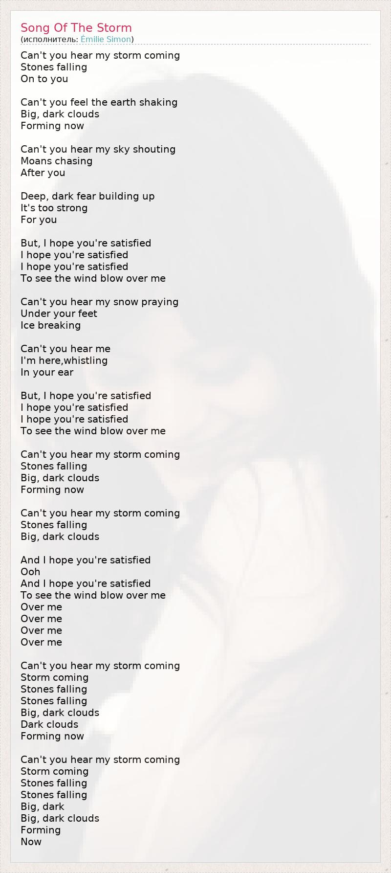Can't you hear my storm coming Stones falling On to you Can't you feel the earth shaking Big, dark clouds Forming now Can't you hear my sky shouting Moans chasing After you Deep, dark fear building up It's too strong For you But, I hope you're satisfied I hope you're satisfied I hope you're satisfied To see the wind blow over me Can't you hear my snow praying Under your feet Ice breaking Can't you hear me I'm here,whistling In your ear But, I hope you're satisfied I hope you're satisfied I hope you're satisfied To see the wind blow over me Can't you hear my storm coming Stones falling Big, dark clouds Forming now Can't you hear my storm coming Stones falling Big, dark clouds And I hope you're satisfied Ooh And I hope you're satisfied To see the wind blow over me Over me Over me Over me Over me Can't you hear my storm coming Storm coming Stones falling Stones falling Big, dark clouds Dark clouds Forming now Can't you hear my storm coming Storm coming Stones falling Stones falling Big, dark Big, dark clouds Forming Now