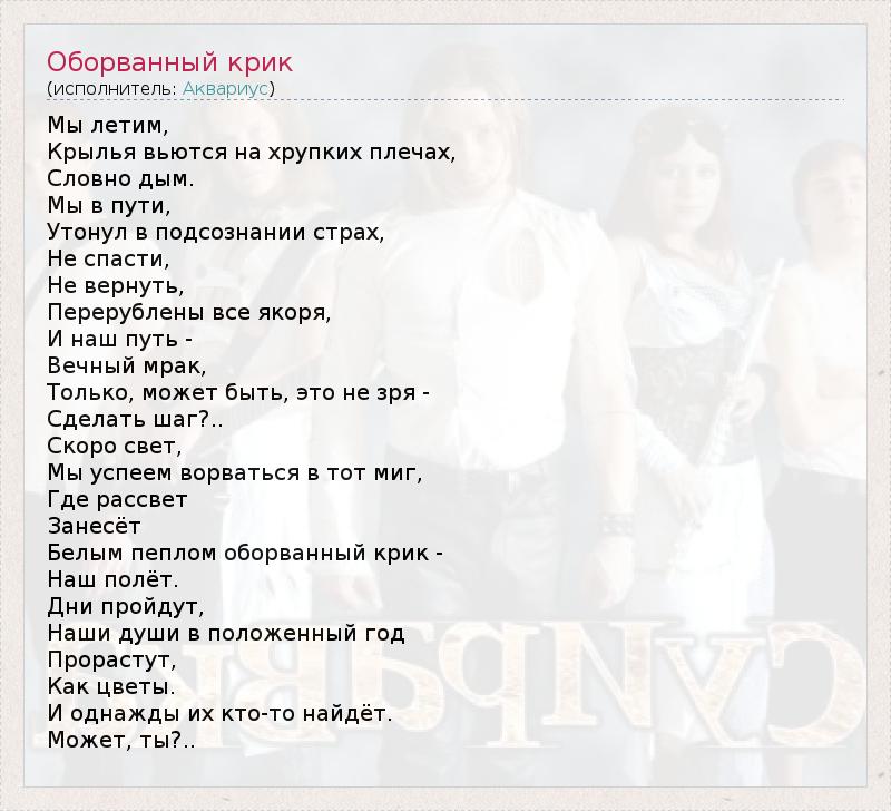 Мы летим, Крылья вьются на хрупких плечах, Словно дым. Мы в пути, Утонул в подсознании страх, Не спасти, Не вернуть, Перерублены все якоря, И наш путь - Вечный мрак, Только, может быть, это не зря - Сделать шаг?.. Скоро свет, Мы успеем ворваться в тот миг, Где рассвет Занесёт Белым пеплом оборванный крик - Наш полёт. Дни пройдут, Наши души в положенный год Прорастут, Как цветы. И однажды их кто-то найдёт. Может, ты?..