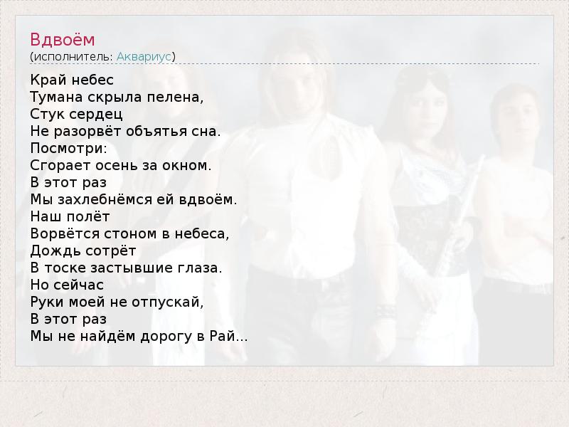 Край небес Тумана скрыла пелена, Стук сердец Не разорвёт объятья сна. Посмотри: Сгорает осень за окном. В этот раз Мы захлебнёмся ей вдвоём. Наш полёт Ворвётся стоном в небеса, Дождь сотрёт В тоске застывшие глаза. Но сейчас Руки моей не отпускай, В этот раз Мы не найдём дорогу в Рай...