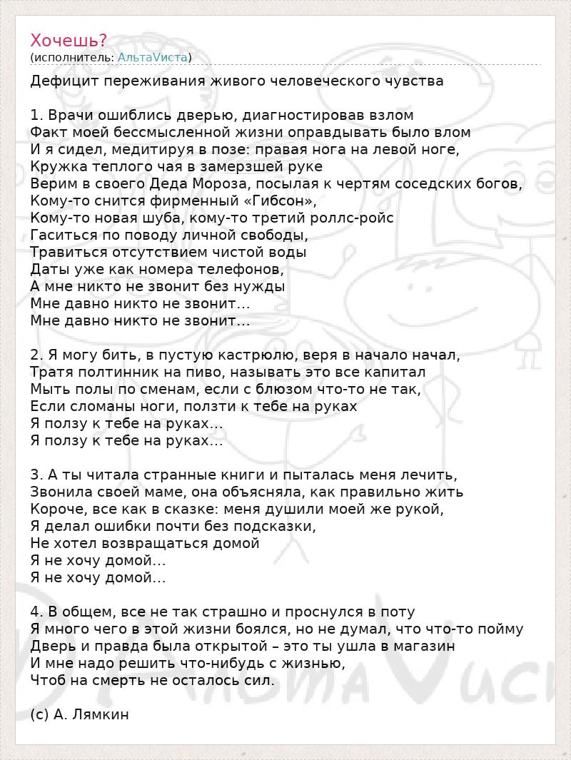 Дефицит переживания живого человеческого чувства 1. Врачи ошиблись дверью, диагностировав взлом Факт моей бессмысленной жизни оправдывать было влом И я сидел, медитируя в позе: правая нога на левой ноге, Кружка теплого чая в замерзшей руке Верим в своего Деда Мороза, посылая к чертям соседских богов, Кому-то снится фирменный «Гибсон», Кому-то новая шуба, кому-то третий роллс-ройс Гаситься по поводу личной свободы, Травиться отсутствием чистой воды Даты уже как номера телефонов, А мне никто не звонит без нужды Мне давно никто не звонит… Мне давно никто не звонит… 2. Я могу бить, в пустую кастрюлю, веря в начало начал, Тратя полтинник на пиво, называть это все капитал Мыть полы по сменам, если с блюзом что-то не так, Если сломаны ноги, ползти к тебе на руках Я ползу к тебе на руках… Я ползу к тебе на руках… 3. А ты читала странные книги и пыталась меня лечить, Звонила своей маме, она объясняла, как правильно жить Короче, все как в сказке: меня душили моей же рукой, Я делал ошибки почти без подсказки, Не хотел возвращаться домой Я не хочу домой… Я не хочу домой… 4. В общем, все не так страшно и проснулся в поту Я много чего в этой жизни боялся, но не думал, что что-то пойму Дверь и правда была открытой – это ты ушла в магазин И мне надо решить что-нибудь с жизнью, Чтоб на смерть не осталось сил. (с) А. Лямкин