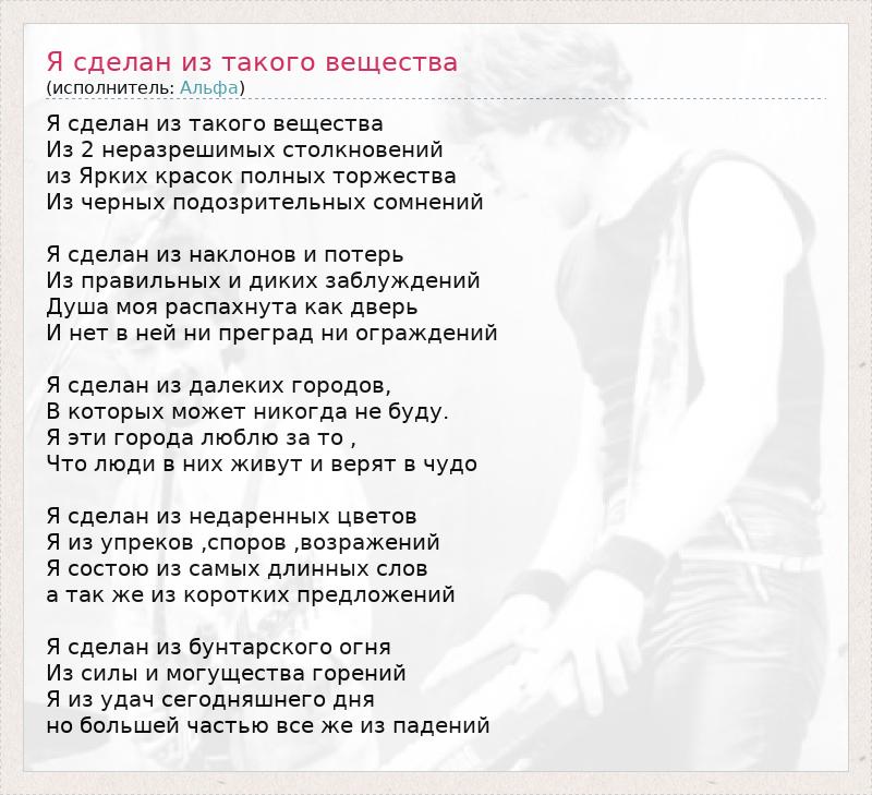 Я сделан из такого вещества Из 2 неразрешимых столкновений из Ярких красок полных торжества Из черных подозрительных сомнений Я сделан из наклонов и потерь Из правильных и диких заблуждений Душа моя распахнута как дверь И нет в ней ни преград ни ограждений Я сделан из далеких городов, В которых может никогда не буду. Я эти города люблю за то , Что люди в них живут и верят в чудо Я сделан из недаренных цветов Я из упреков ,споров ,возражений Я состою из самых длинных слов а так же из коротких предложений Я сделан из бунтарского огня Из силы и могущества горений Я из удач сегодняшнего дня но большей частью все же из падений