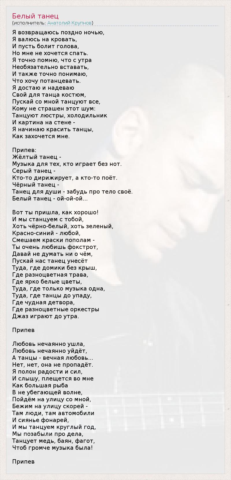 Я возвращаюсь поздно ночью, Я валюсь на кровать, И пусть болит голова, Но мне не хочется спать. Я точно помню, что с утра Необязательно вставать, И также точно понимаю, Что хочу потанцевать. Я достаю и надеваю Свой для танца костюм, Пускай со мной танцуют все, Кому не страшен этот шум: Танцуют люстры, холодильник И картина на стене - Я начинаю красить танцы, Как захочется мне. Припев: Жёлтый танец - Музыка для тех, кто играет без нот. Серый танец - Кто-то дирижирует, а кто-то поёт. Чёрный танец - Танец для души - забудь про тело своё. Белый танец - ой-ой-ой... Вот ты пришла, как хорошо! И мы станцуем с тобой, Хоть чёрно-белый, хоть зеленый, Красно-синий - любой, Смешаем краски пополам - Ты очень любишь фокстрот, Давай не думать ни о чём, Пускай нас танец унесёт Туда, где домики без крыш, Где разноцветная трава, Где ярко белые цветы, Туда, где только музыка одна, Туда, где танцы до упаду, Где чудная детвора, Где разноцветные оркестры Джаз играют до утра. Припев Любовь нечаянно ушла, Любовь нечаянно уйдёт, А танцы - вечная любовь... Нет, нет, она не пропадёт. Я полон радости и сил, И слышу, плещется во мне Как большая рыба В не убегающей волне, Пойдём на улицу со мной, Бежим на улицу скорей - Там люди, там автомобили И сиянье фонарей, И мы танцуем круглый год, Мы позабыли про дела, Танцует медь, баян, фагот, Чтоб громче музыка была! Припев