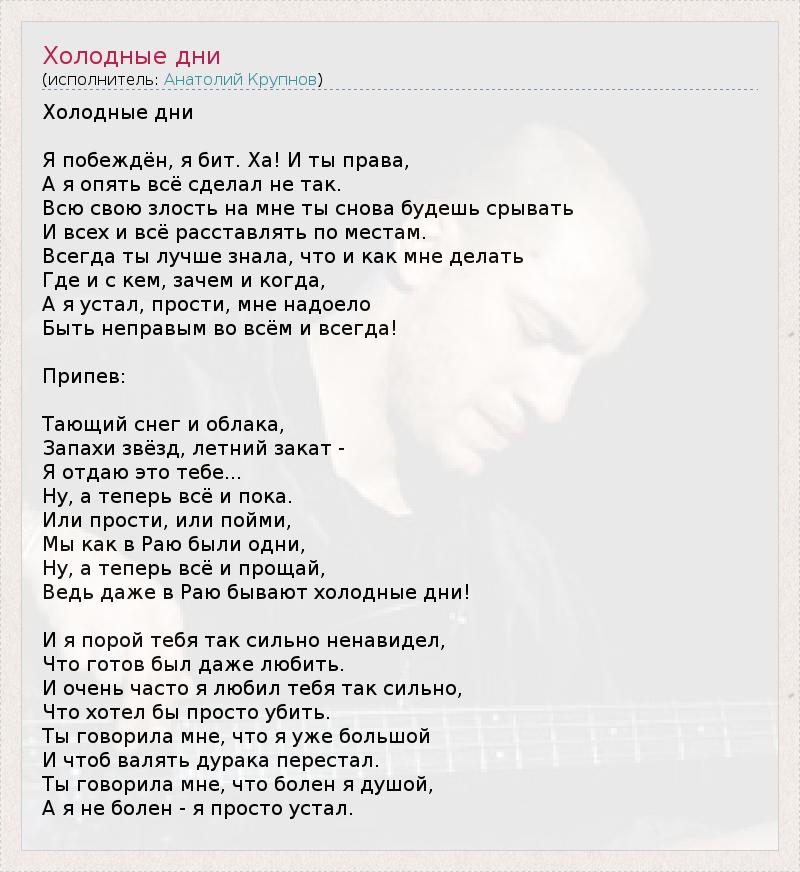 Холодные дни Я побеждён, я бит. Ха! И ты права, А я опять всё сделал не так. Всю свою злость на мне ты снова будешь срывать И всех и всё расставлять по местам. Всегда ты лучше знала, что и как мне делать Где и с кем, зачем и когда, А я устал, прости, мне надоело Быть неправым во всём и всегда! Припев: Тающий снег и облака, Запахи звёзд, летний закат - Я отдаю это тебе... Ну, а теперь всё и пока. Или прости, или пойми, Мы как в Раю были одни, Ну, а теперь всё и прощай, Ведь даже в Раю бывают холодные дни! И я порой тебя так сильно ненавидел, Что готов был даже любить. И очень часто я любил тебя так сильно, Что хотел бы просто убить. Ты говорила мне, что я уже большой И чтоб валять дурака перестал. Ты говорила мне, что болен я душой, А я не болен - я просто устал.
